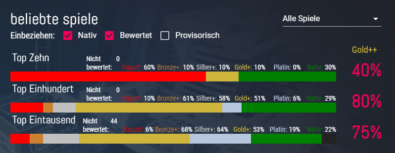 Bin immernoch der Meinung, dass entscheidend ist, wie viele Spiele die neu erscheinen ab Release oder zumindest in der Releasewoche problemlos, also mindestens "Gold", spielbar sind und wie viele davon auch nach etlichen Patches noch laufen bzw. wie oft der User nach Spielupdates eingreifen oder auf Proton Updates/Fixes warten muss. Ich stelle mir nichts ärgerlicheres vor, als nach feierabend ein Spiel mit freunden zu starten, Updates zu laden, nur um dann festzustellen, dass das Game nicht mehr funktioniert und der Fix über Proton erst 2-3 Tage später kommt... (wie lange dauert sowas eigentlich?)