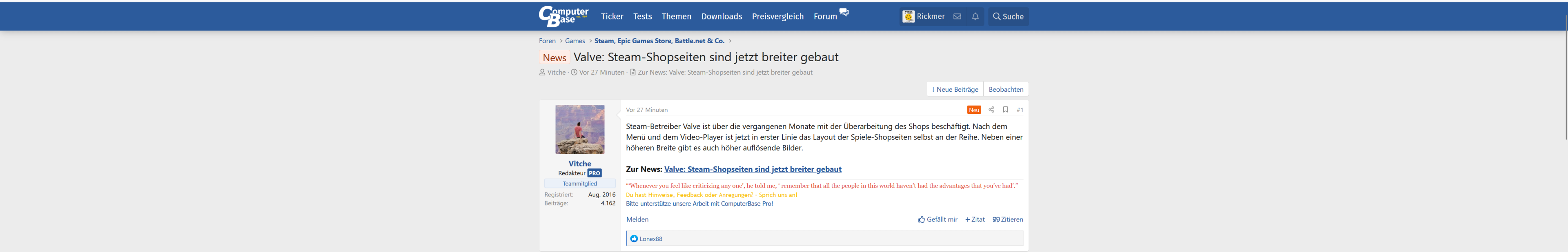 Was das nun speziell bei Steam angeht: Ich schaue mir die Seiten eh quasi nie an. Zur Verwaltung meiner Bibliothek bzw. Wishlist greife ich auf externe Webseiten zu, und kaufen tue ich nur noch selten direkt bei Steam. Meistens sind die offiziellen Reseller einfach deutlich günstiger. Mehr als das "Redeem Key" Fenster krieg ich von Steam also in aller Regel nicht zu sehen, wenn ich nicht gerade explizit mal nach Rezensionen schaue.