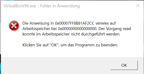 ich bekomme, wenn ich eine VM neustarte (Windows 10 2004 / Linux Mint / Fedora 32) folgende Fehlermeldung: