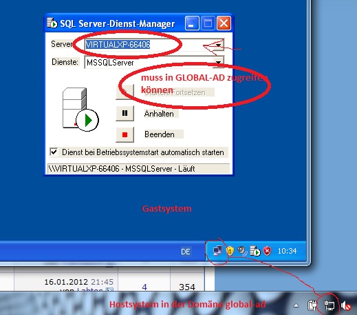 Jetzt habe ich das das Problem, dass der SQL Server in XP auf eine Domäne zurgreifen muss, also die vom Host. Jetzt komme ich vom Gastsystem nicht in die Domäne.