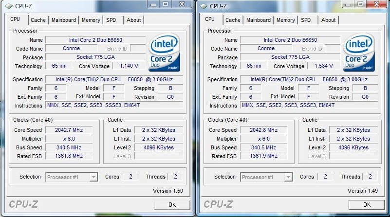 Könnte evt. auch an der Version liegen. Siehe Bild , einmal CPU-Z 1.50 einmal Version 1.49.