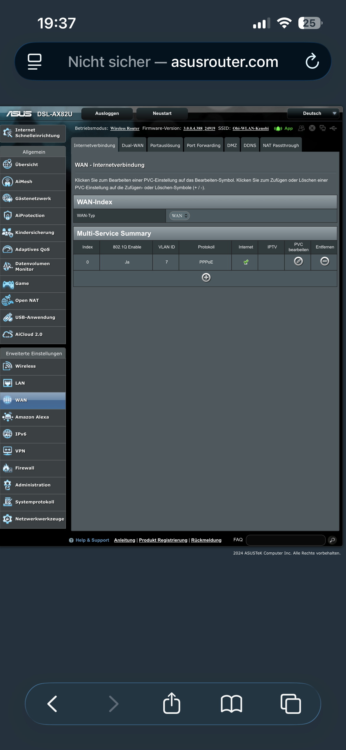 Ich habe (laut ChatGPT Anleitung) dss Lan Kabel an den WAN Port gesteckt und im browser konfiguriert. Siehe Bilder.