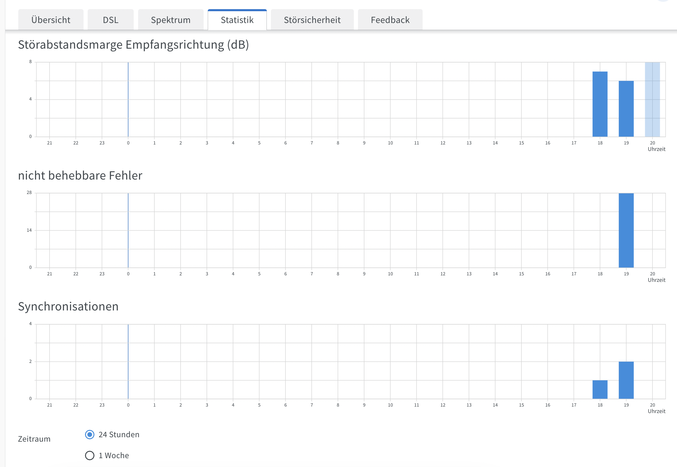 wir sind Dezember 23 in eine neue Wohnung gezogen. Haben unseren VDSL 250mbit/s Anschluss mitgenommen und hatten damit auch lange keine Probleme. Seit neustem sehe ich in der FritzBox (7590AX) einige korrigierte (ca. 30-100/min) DTUs in Kombination mit mehreren Verbindungsabbrüchen pro Tag. So wie ich das verstehe sind die korrigierten DTUs in der Menge (noch) kein Problem? Mit Verbindungsabbruch meine ich, dass die FritzBox die DSL Verbindung neu synchronisiert.