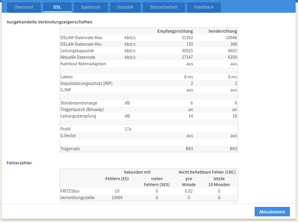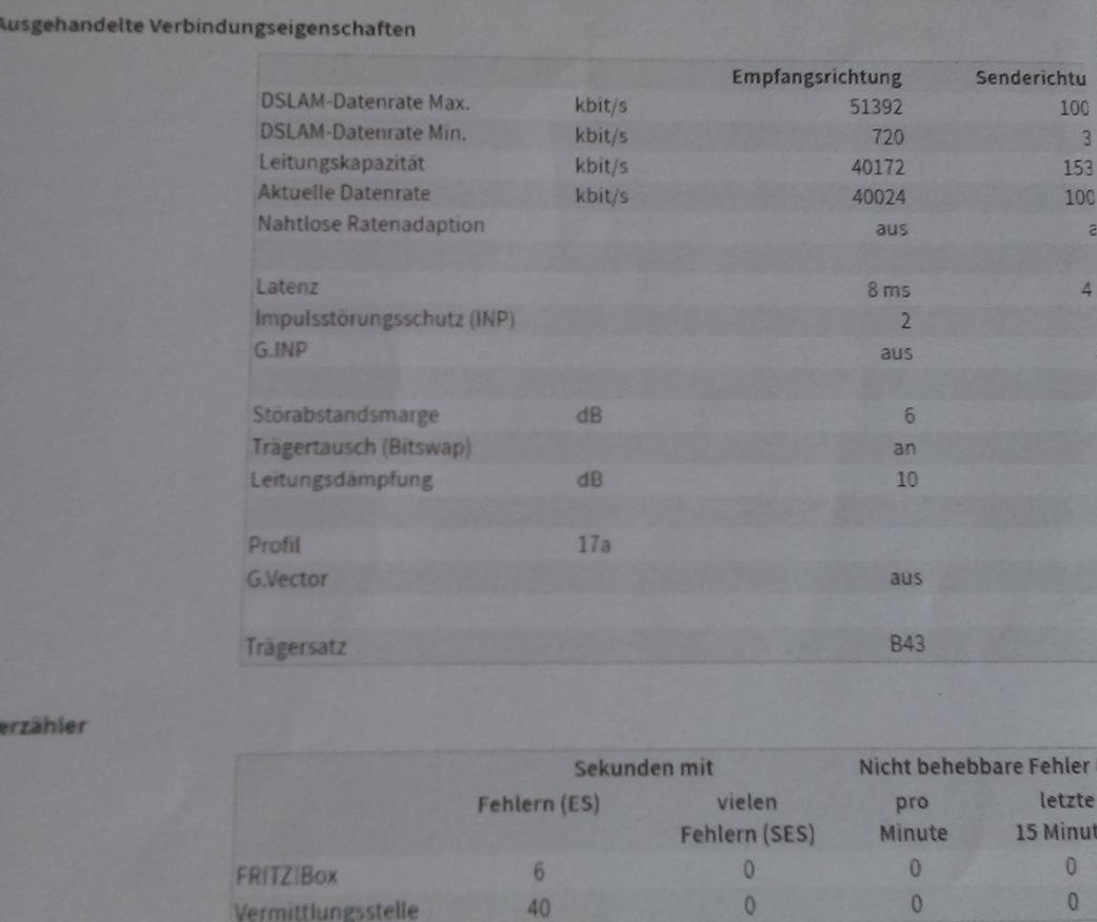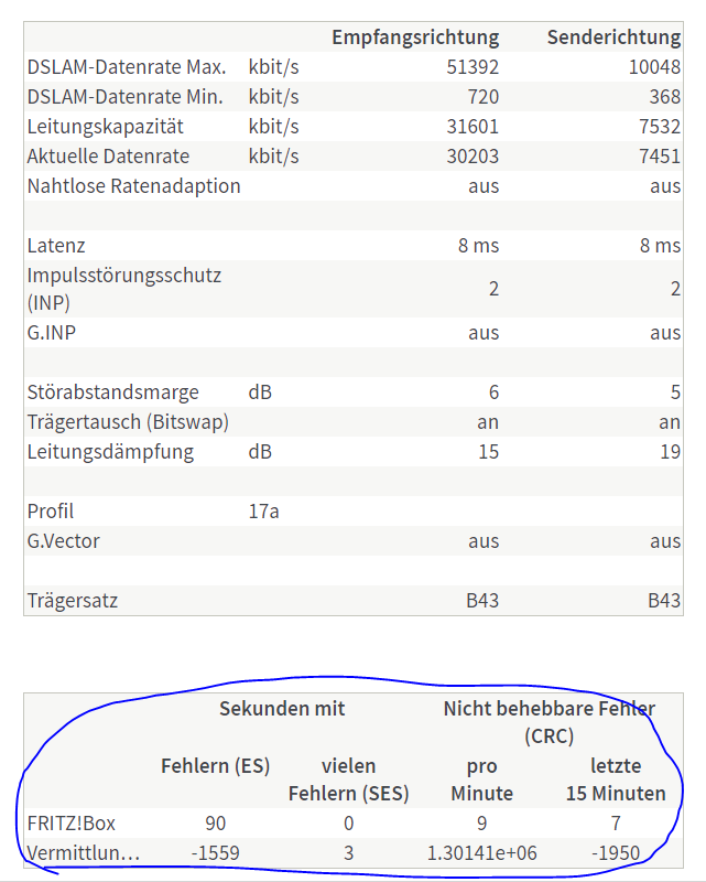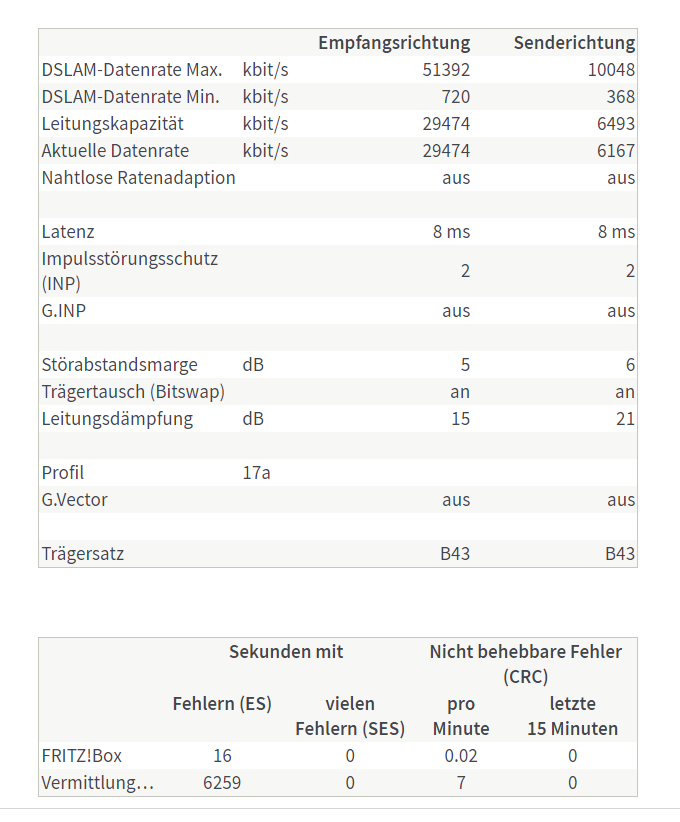 - Tausch der Fritzbox gegen eine mit älterem Fritz OS brauchte keinen anderen Werte bei Leitungskapazität und Störabstandsmarge. Stabilität wegen gleicher Werte nicht getestet.