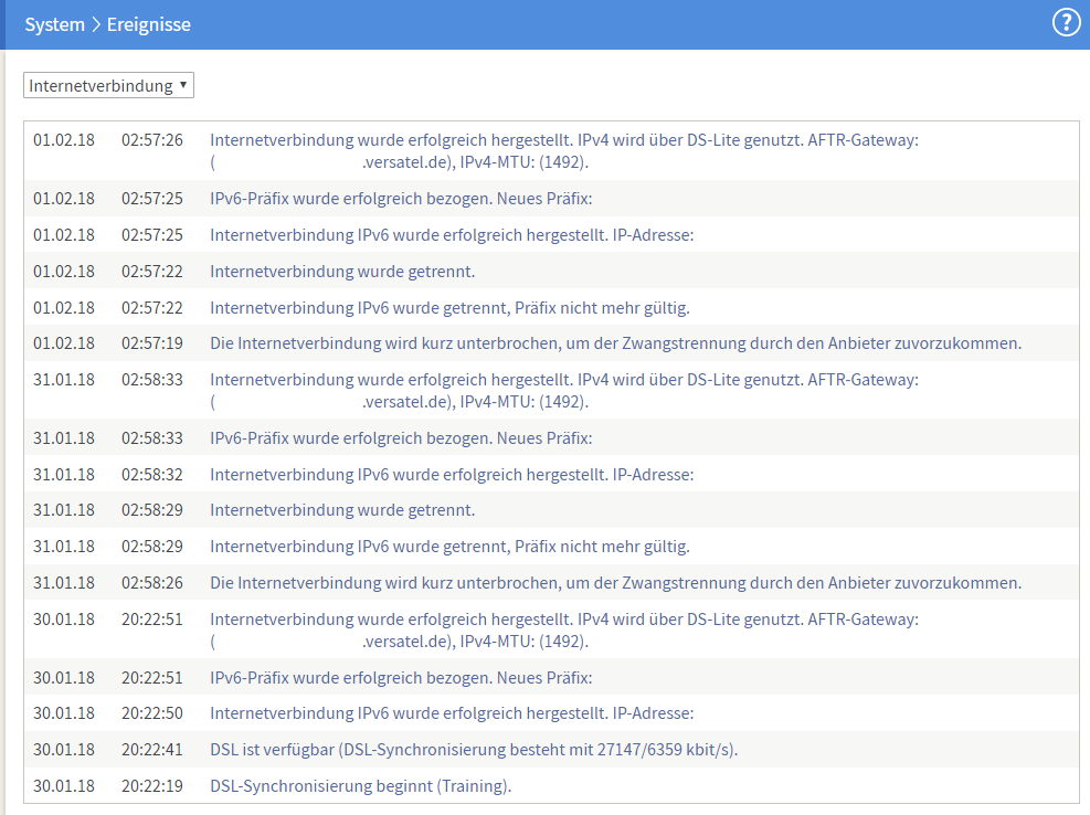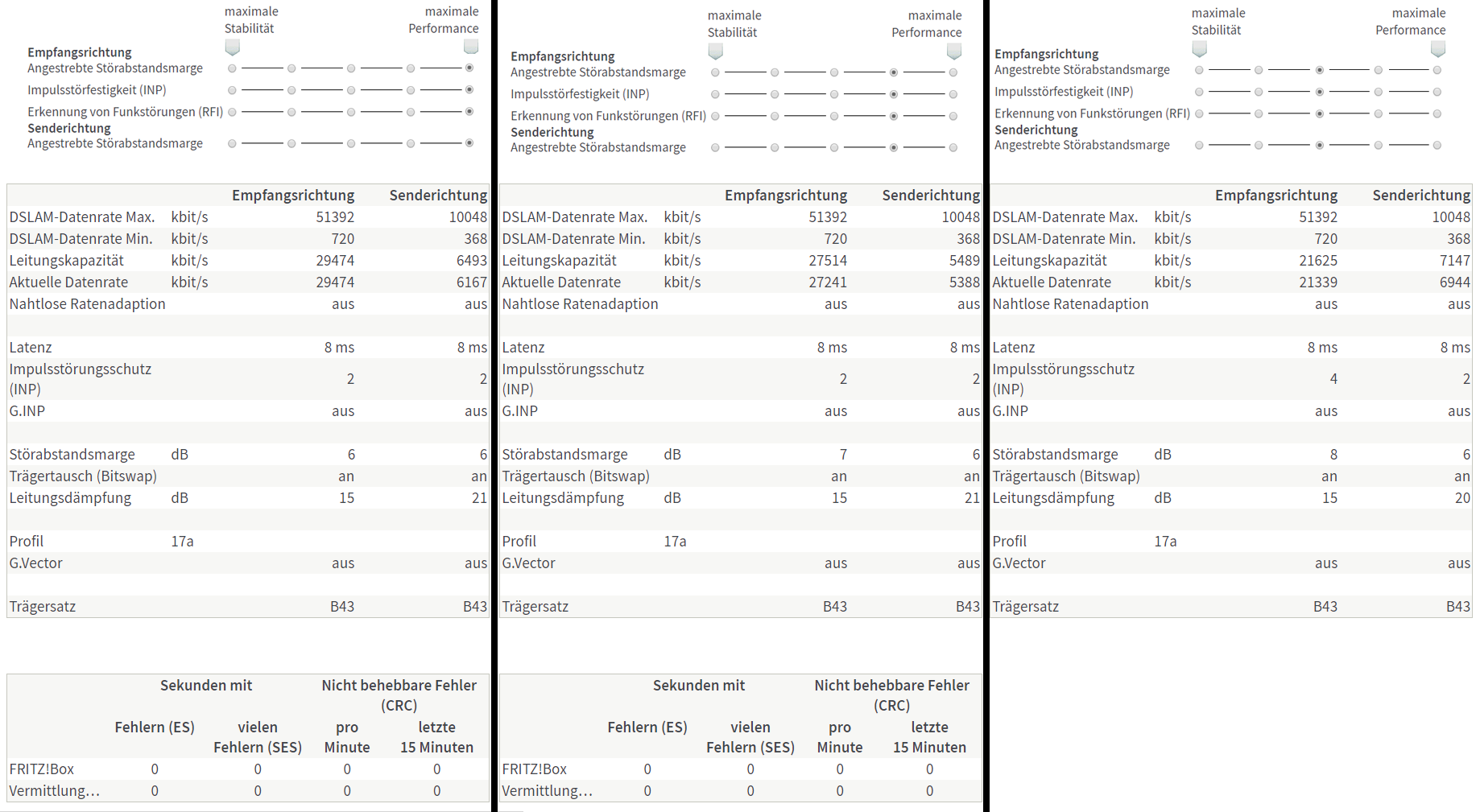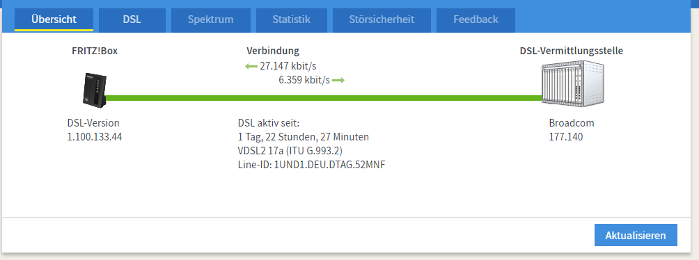 - Keine Stabilitätseinstellung unter DSL-Informationen > Störsicherheit brachte Stabilität, außer dass ich am Schluss bei DSL 16000 Geschwindigkeit war. gab immer noch stündlich Neuaufbau der DSL Verbindung.