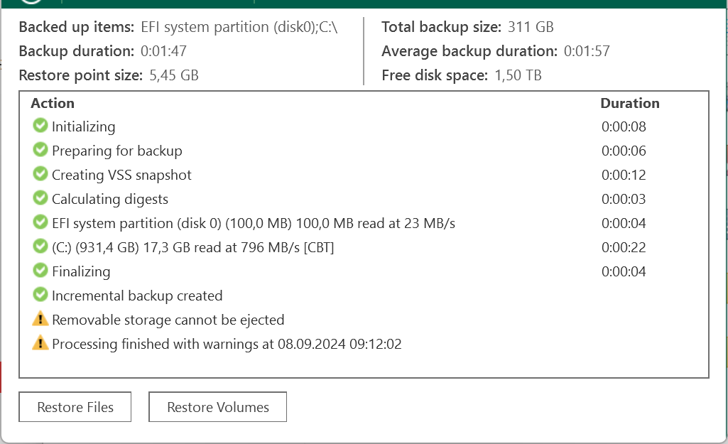 Ja, funktioniert auch unter Windows 11. Und darauf achten, ob Prozesse (Abgesehen von Veeam selbst) auftauchen, die auf Dateien auf der Festplatte, die ausgeworfen werden soll, zugreifen.