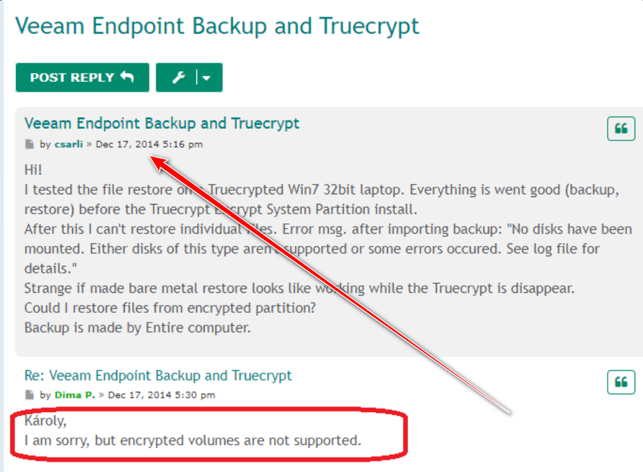 Ich habe auch oben die Veracrypt verschlüsselte Festplatten erwähnt. Die Veracrypt Verschlüsslung ist doch eine aktuelle Software, oder? Das Veeam kann also auch mit dieser Verschlüsselung nicht zu recht kommen.