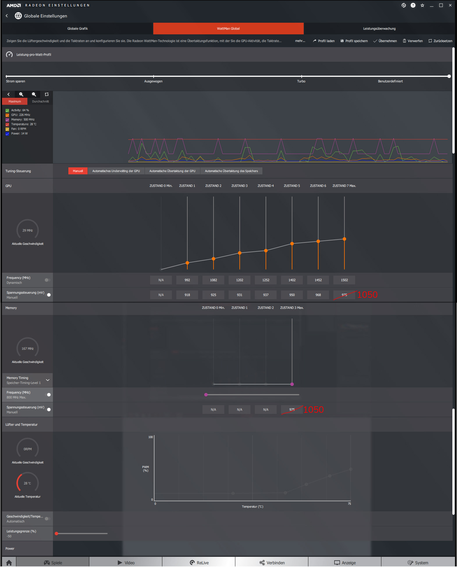 danach bitte noch bei den von mir oben geposteten einstellungen mit 975 die leistungsgrenze auf -50% stellen und die frequenz für die gpu in Zustand 6 auf 1452 und Zustand 7 auf 1502 heruntersetzen und nochmal probieren.