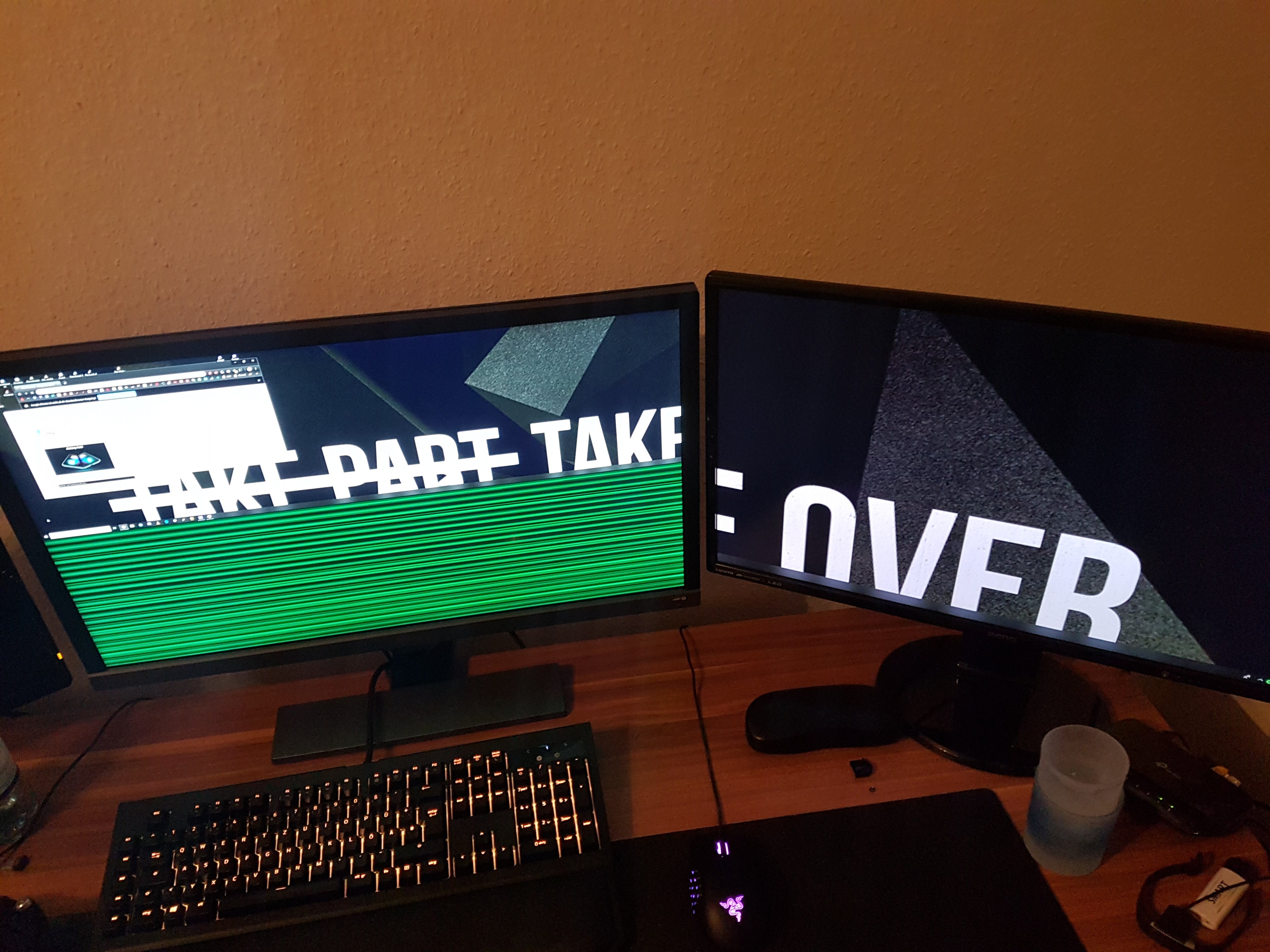 Nun bekomme ich ab und zu folgendes Problem, die Monitore werden zu einem verschmolzen und eine extrem hohe Auflösung wird eingestellt(5000 x irgendwas), das Bild streckt sich dabei über alle Monitore.