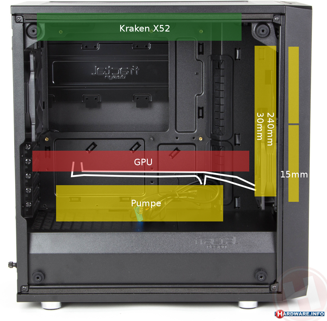 Die 15mm Noctua-Fan sind nötig da das Meshify C eine maximale Kartenlänge von 315mm unterstützt (während 30mm Fans montiert sind). Die Vega hat ne PCB länge von ~290mm, Platz für einen 30mm Radiator + 30mm Fans gibt es also nicht.