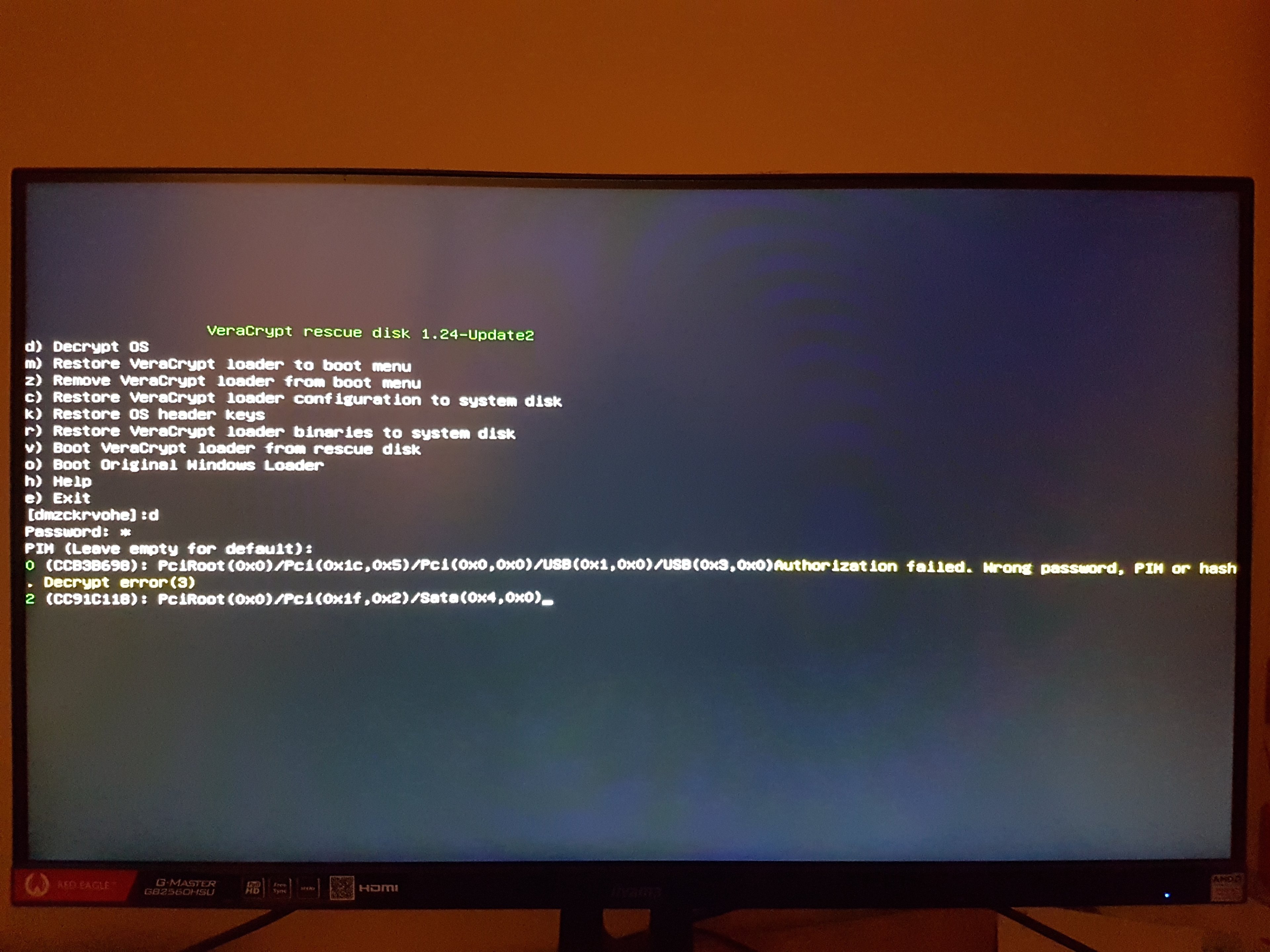Soweit so schlecht. Das größere Problem ist nun, dass ich unter Verwendung der Rescue Disk USB zwar nach der Auswahl "o" ins "boot original windows loader" komme, dort dann aber mir VeryCrypt sagt, dass überhaupt nichts verschlüsselt ist (was ja stimmen mag, da die Verschlüsselung erst nach dem ersten korrekten Neustart erfolgen würde, welcher nie gelang.