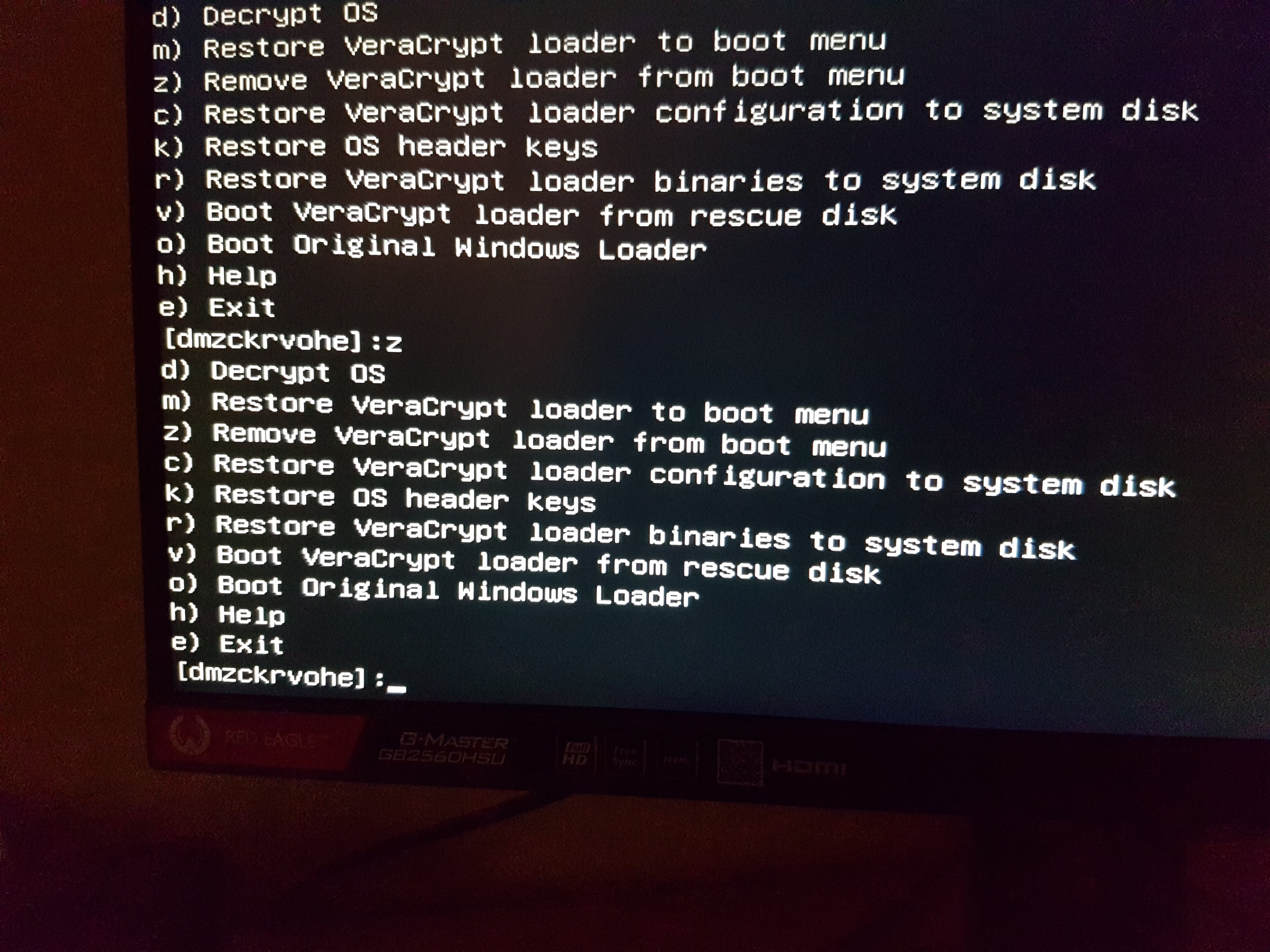 Drücke ich zb "z"-"remove very crypt loader from boot menu" (was für mich bedeutet, dass ich wieder windows ohne veracrypt starten könnte), wird mir das Menü lediglich wiederholt.
