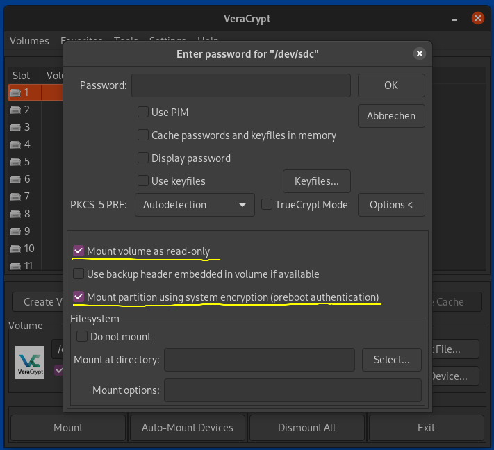 - Ein Neustart hat nicht geholfen. ESCAPE um am VeraCrypt Launcher vorbeizukommen hilft auch nicht.