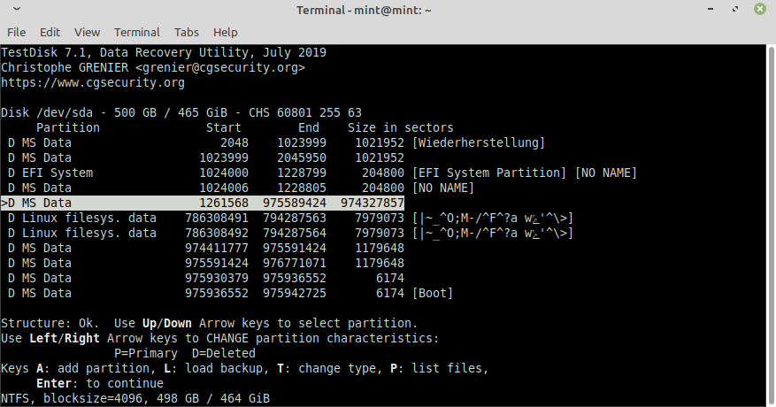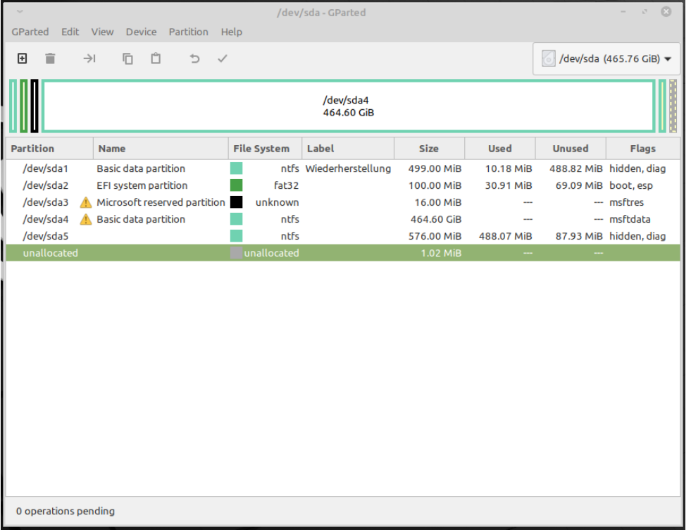 - Ich habe eine Live Disk von Linux Mint gebooted, gparted zeigt folgende Partitionen (gparted.png).