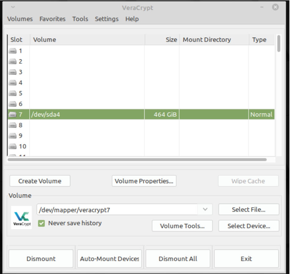 - Ich habe in Mint Veracrypt installiert und sda4 gemounted ( 'do not mount file system option')