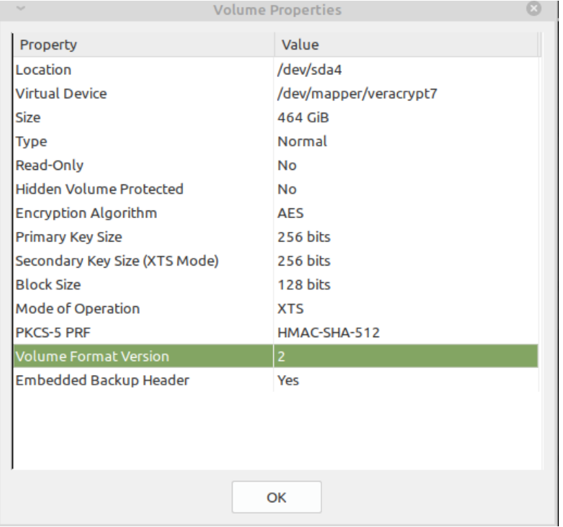 - Volume Properties in Veracrypt zeigt folgendes (vera2.png)