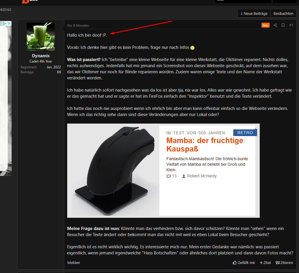 Ich habe natürlich sofort nachgesehen was da los ist aber tja, nix war los. Alles war wie gewohnt. Ich habe gefragt wie er das gemacht hat und er sagte er hat im FireFox einfach den "Inspektor" benutzt und die Texte verändert.