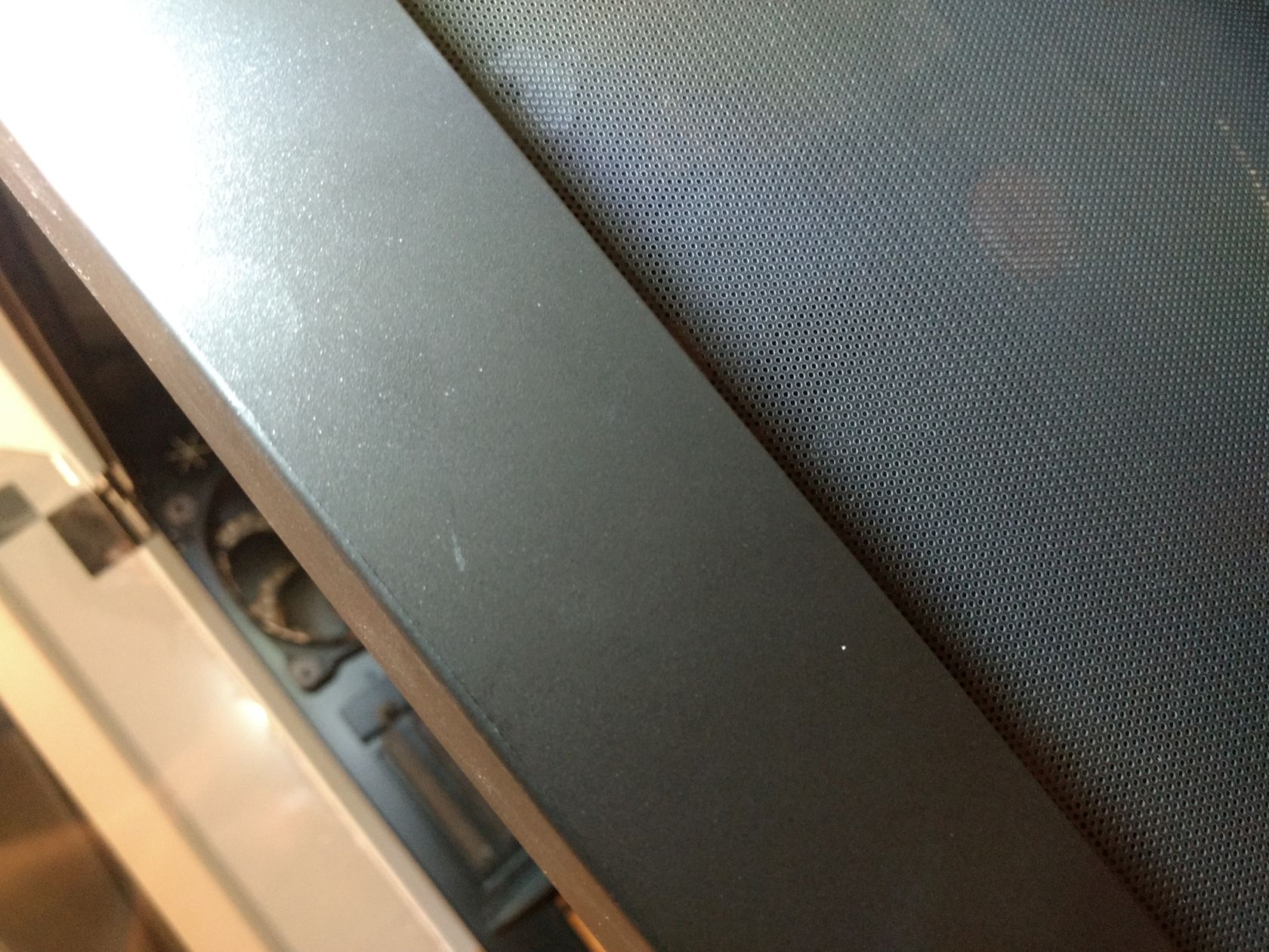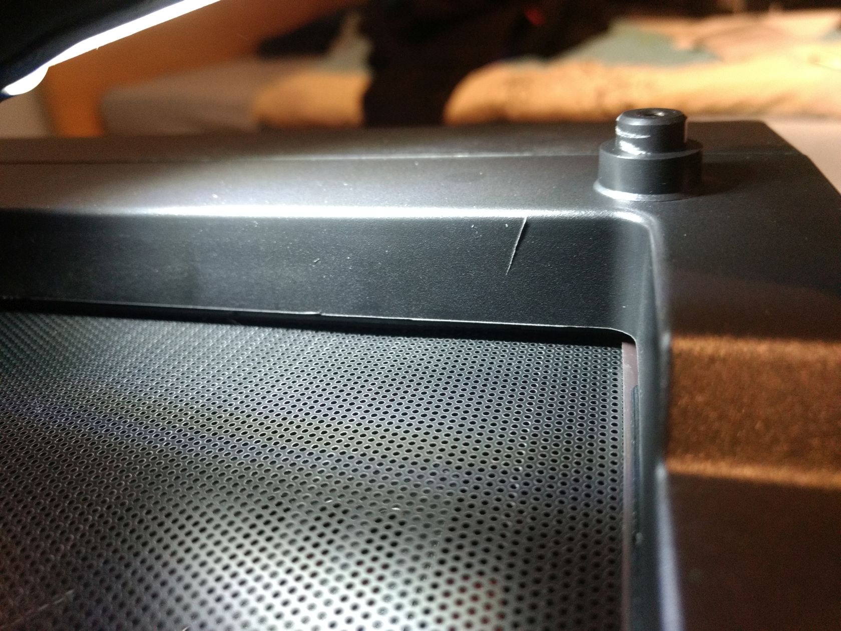 Der Kunststoffeckel schaut so aus als hätte jemand versucht den mit einen Schraubenzieher an mehreren Stellen aufzuhebeln. Macken am Kunststoff und Fingerabdrücke sind auch überall. Slotblenden waren auch schonmal welche draussen und man sieht dass auch hier die Schrauben schief reingedreht wurden.