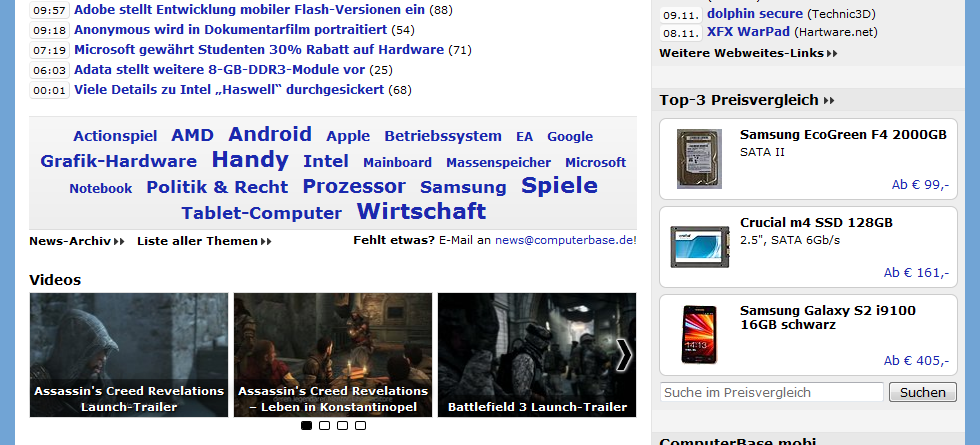 Die Downloads haben mit der Layout-Änderung an der Startseite vor ein paar Wochen (die neue Artikel-Box oben) schon etwas gelitten. Die Tags gehen so weit unten auf der Startseite ein weg unter, das stimmt. Vielleicht wären die Tags aber auch unterhalb der News-Liste auf der Startseite gut aufgehoben? Also oberhalb der Videos. Dann wären sie zwar nicht weiter oben platziert, könnten aber im Hauptbereich mehr auffallen als im Seitenstreifen.[F]L4SH schrieb:Wie Fehlermeldung (geiler aber unpraktisch zu zitierender Nickname) weiter oben schon gesagt hat, wäre es gut, wenn man die neue Funktion weiter oben platzieren würde. Die Tags gehen unter.