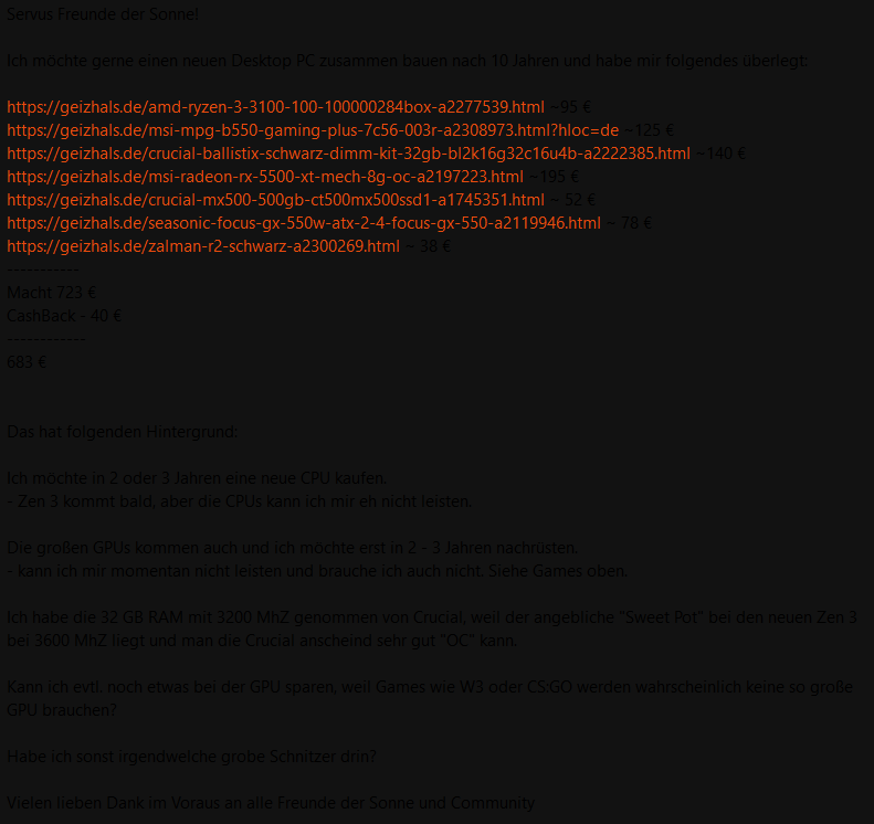 Ich möchte gerne einen neuen Desktop PC zusammen bauen nach 10 Jahren und habe mir folgendes überlegt: