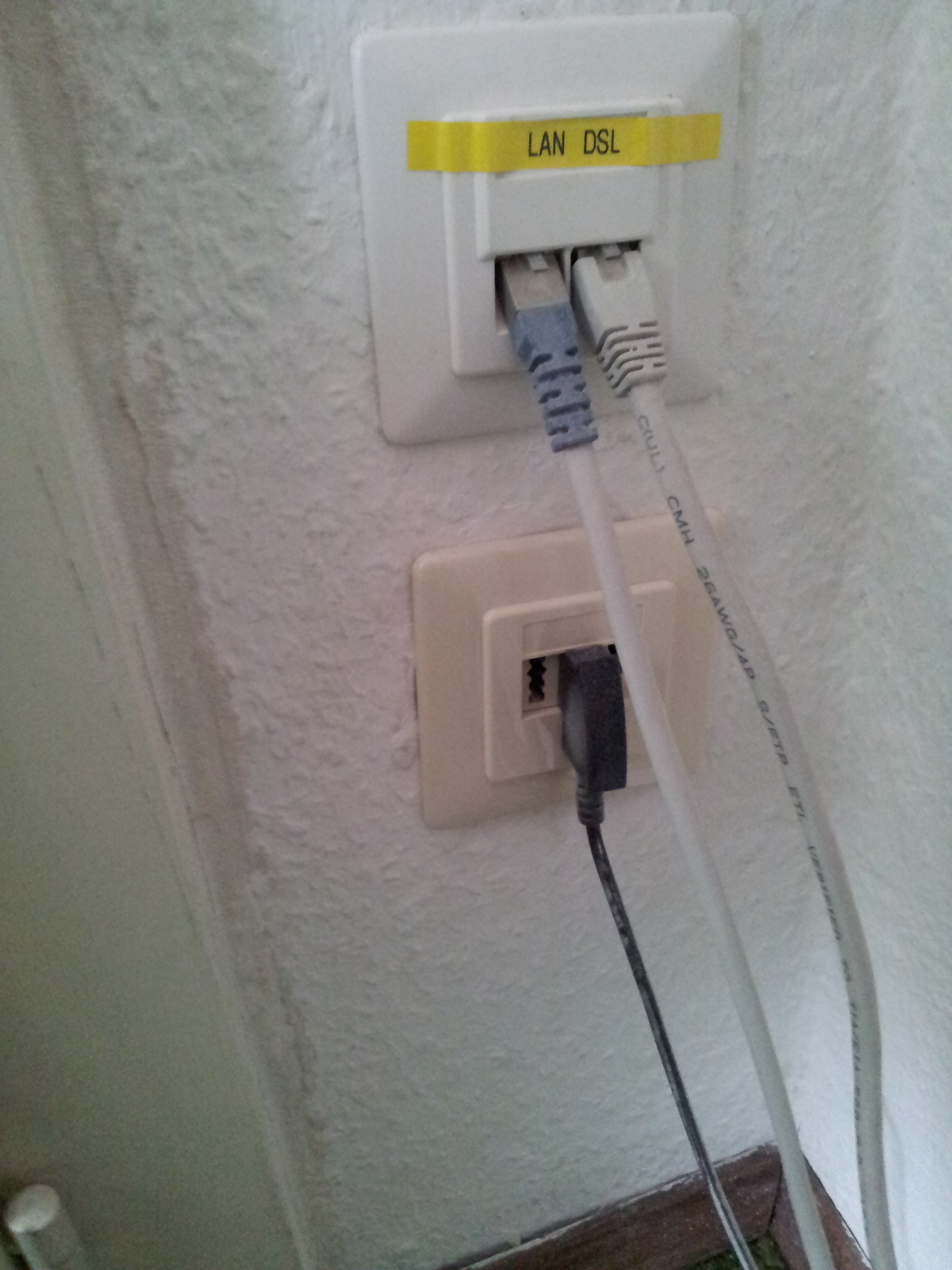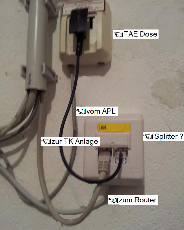 von da aus geht ein dünnes Telefon Kabel (zwei Adern werden genutzt) an die erste TAE.