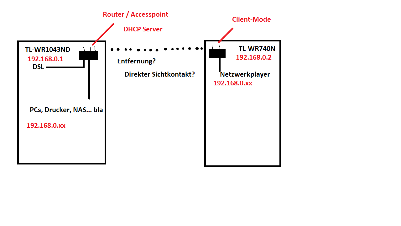 Ich habe es schon mit der Einstellung WDS-Brücke in Router 1043 versucht, aber ich schaffe es nicht, eine Verbindung mit Router 740 herzustellen. Ich komme nicht in das Einstellungsmenü von Router 740. Wo liegt mein Denkfehler?