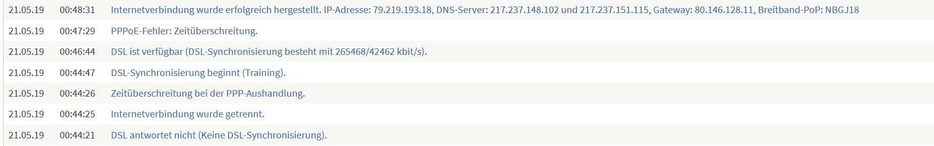 Laut Telekom Support sieht man angeblich diese Abbrüche nicht von der Telekom Seite aus. Kann ich mir irgendwie nicht vorstellen wenn die DSL Sychronisierung komplett weg ist.