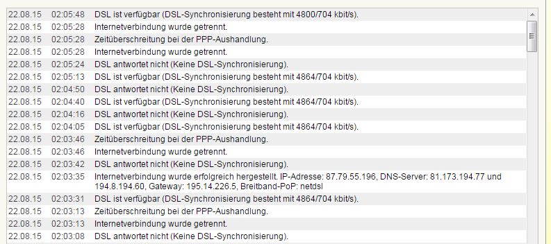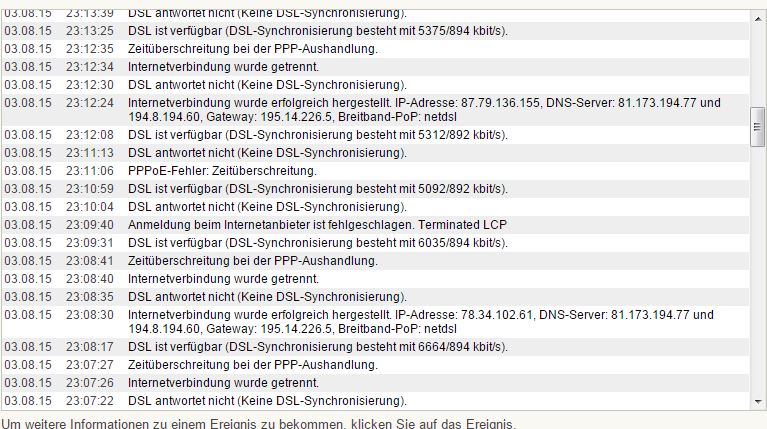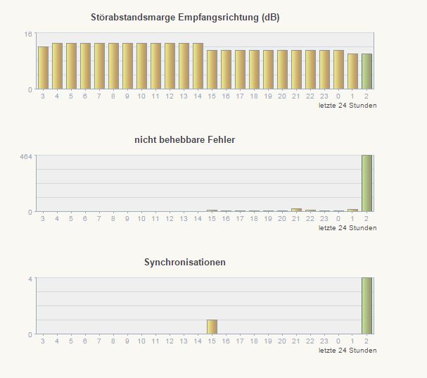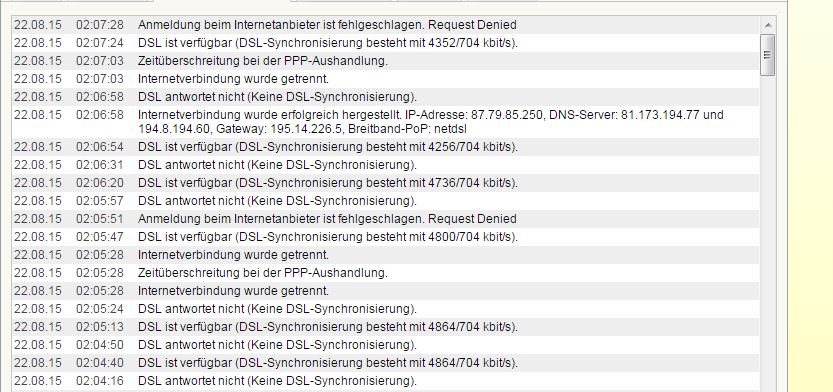 Jedenfalls gab es den ersten Verbindungsabbruch am selben Tag gegen 22 Uhr, danach wieder um 1 Uhr Nachts. Und hier braucht der Router wieder länger für den Verbindungsaufbau, bis ich dann am Ende 4Mbit hatte.