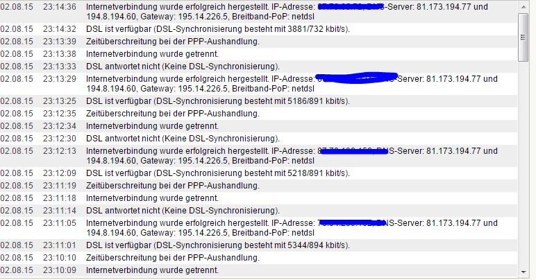 Es nervt mich momentan total und auch alle anderen Damen und Herren im Hause sind nicht begeistert. Entweder wir haben tagsüber Internet und da eben die 2-5MBit (bei 5 Leuten im Haus), oder eben die Verbindungsabbrüche am Abend.