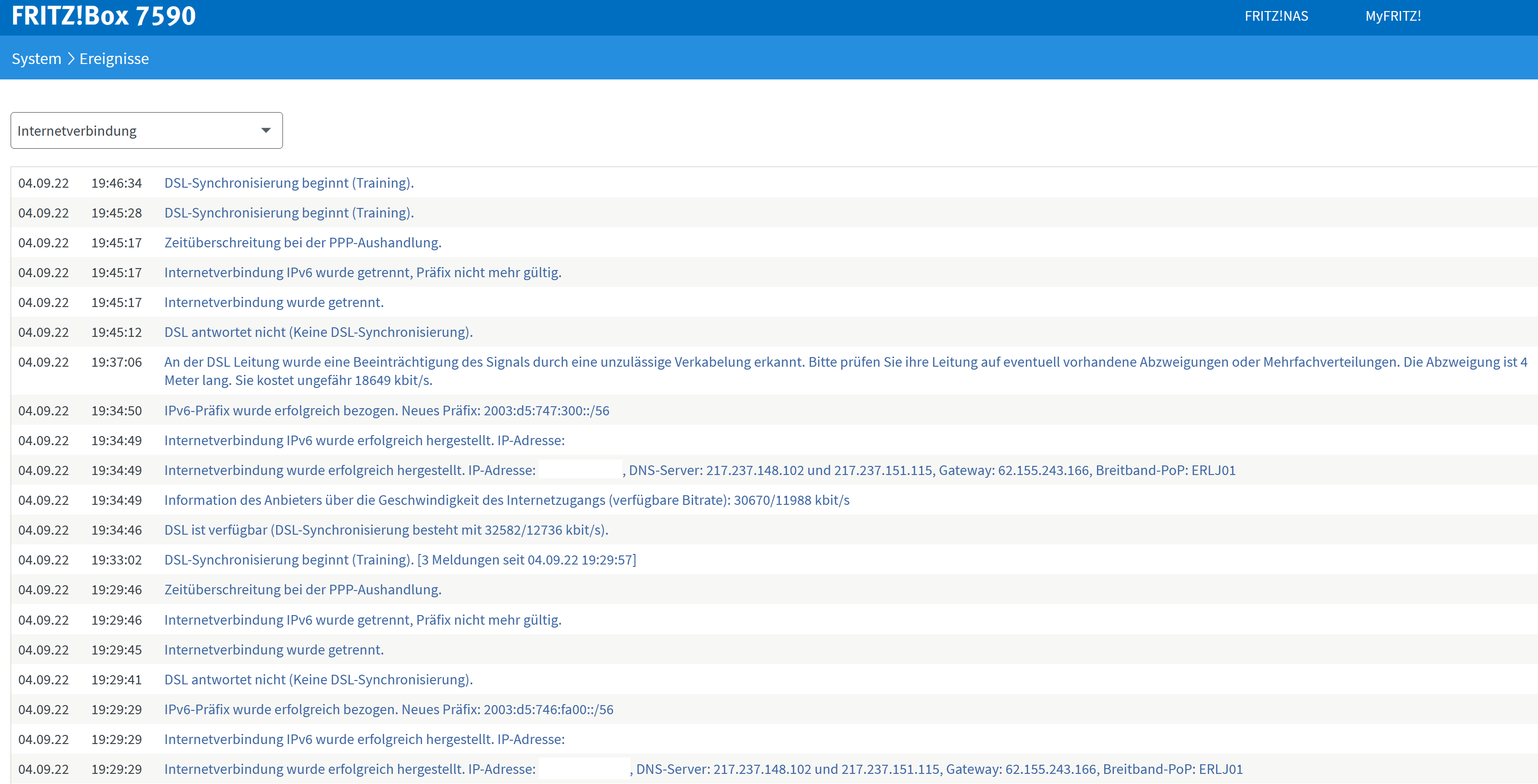 Ansonsten wurde die TAE-Dose schon zweimal komplett neu gemacht. Es wurden mehrere DSL-Anschlusskabel von der TAE-Dose zur FritzBox getestet. Gleiches Problem tritt auch mit einer FritzBox 7490 auf.