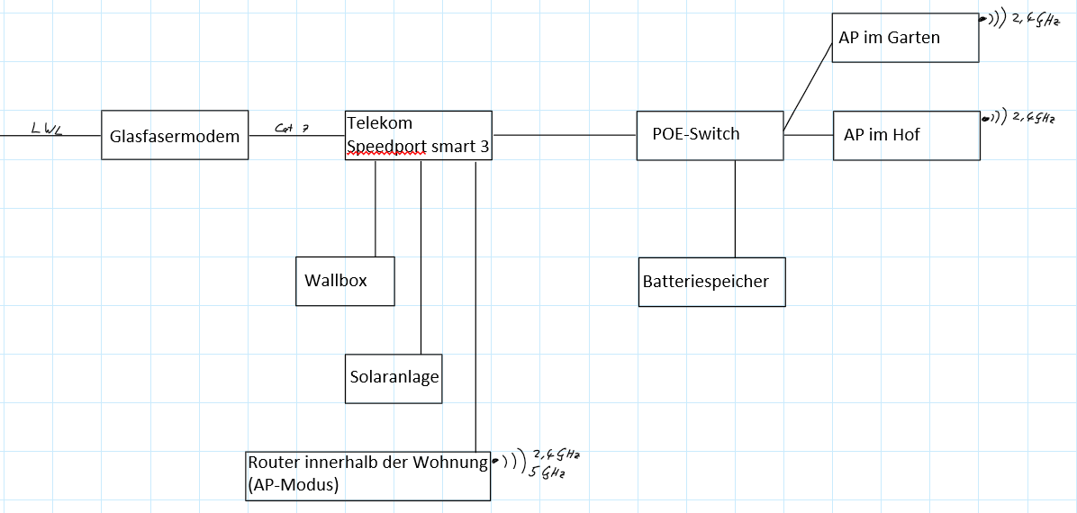 Das Setup ist wie im Angehängten Bild. Ein Speedport Smart 3 bekommt über ein Glasfaser Modem Internet, und stellt den DHCP Server. Am Speedport sind mehrere Kabelgebundenen Geräte, ein Switch und ein Archer AX55 Router. Der Router dient nur als Accesspoint und als Switch in der Wohnung.
