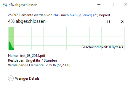 Immer wieder sinkt die Geschwindigkeit auf 0Bytes/s (siehe Screenshot).