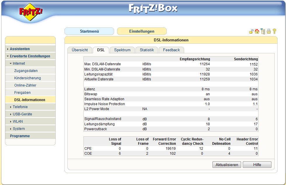Neulich hab ich mal bei meiner Fritzbox nachgeschaut (7170), und erschreckend folgendes gesehen. Der Rauschabstand ist doch eigentlich viel zu gering, und es sind viel zu viele Fehler vorhanden. Die box wurde vor 3-4 std erst mitm Inet neu verbunden.