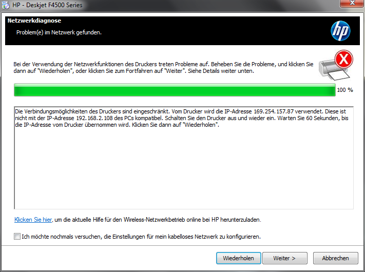 Die Verbindungsmöglichkeiten des Druckers sind eingeschränkt. Vom Drucker wird die IP-Adresse 169.254.157.87 verwendet. Diese ist nicht mit der IP-Adresse 192.168.2.108 des PCs kompatibel. Schalten Sie den Drucker aus und wieder ein. Warten Sie 60 Sekunden, bis die IP-Adresse vom Drucker übernommen wird. Klicken Sie dann auf "Wiederholen".