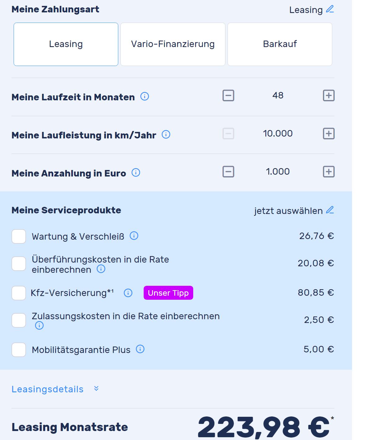 435€/Monat, dazu dann auch noch Wartung, Versicherung, Überführung, Zulassung, und als Sahnehäubchen 1000€ Anzahlung? 😂🤣