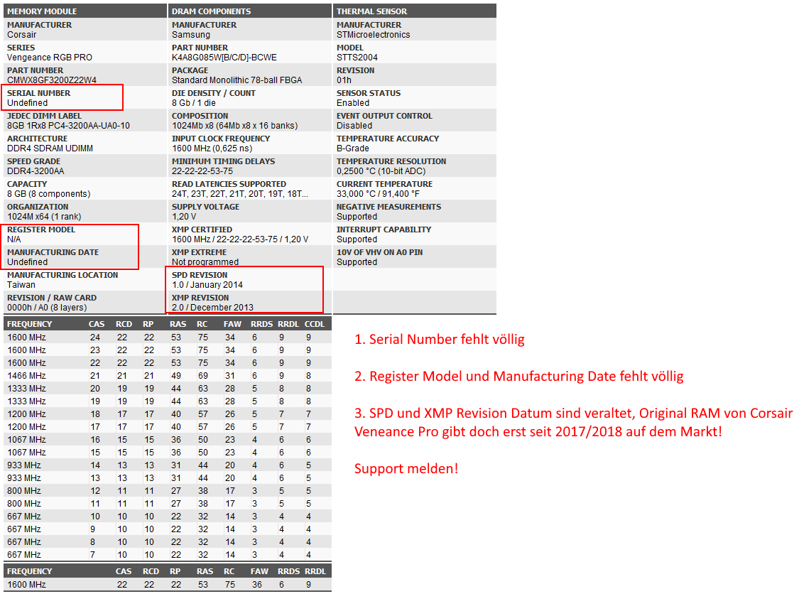 Ich bin 100% sicher dass deinen Arbeitsspeicher eine Fälschung unterjubelt wurde (bzw deine Shop wusste es nicht und baute einfach die gefälschte RAM ohne genaues Überprüfung ein). Solche RAM kann ich nirgendwo im Google herausfinden. Ich würde es raten, sofort Support anzurufen oder Email zu schicken und das Problem schildern (eventuell meine Anhang schicken)