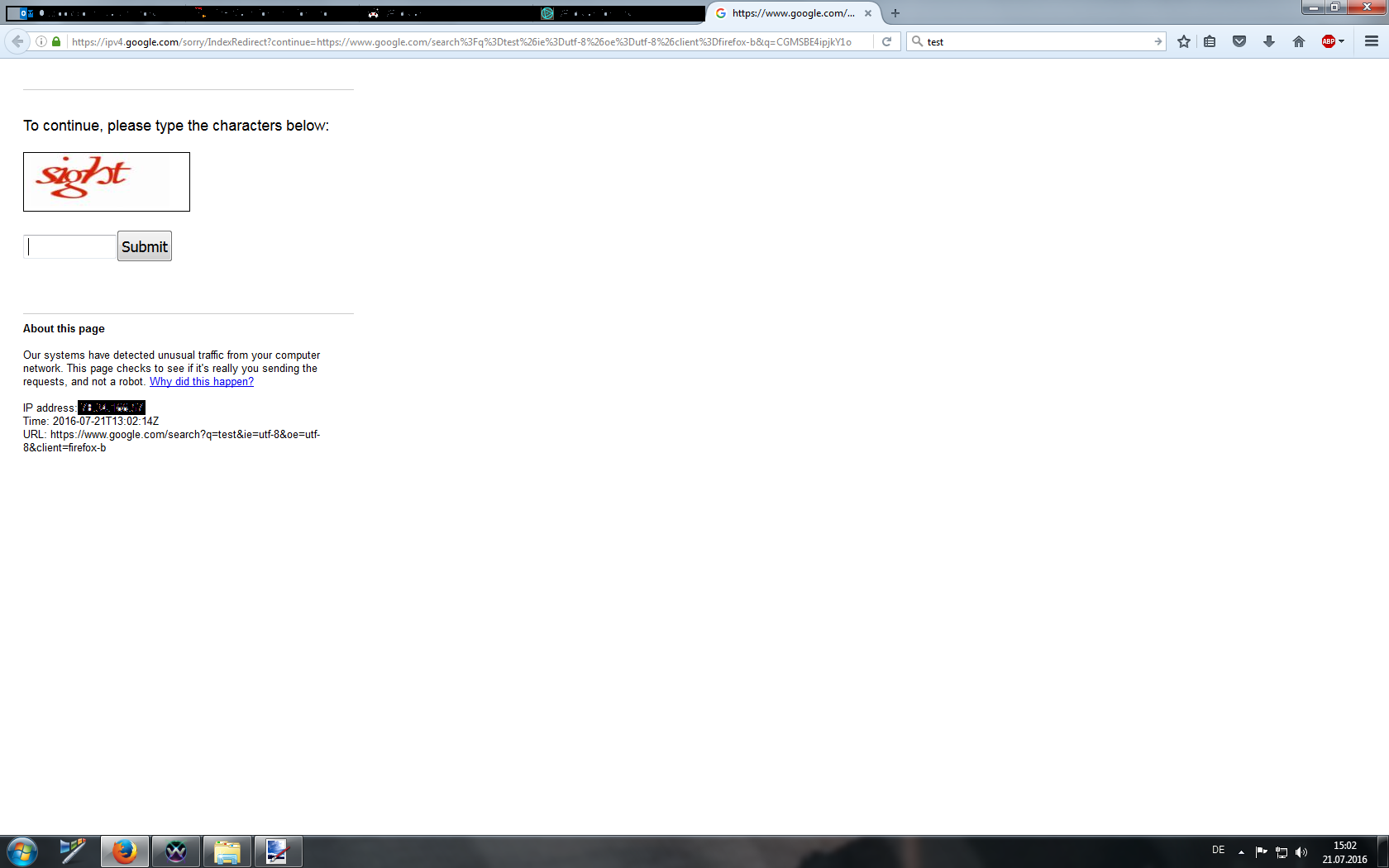 Ich habe das vorher noch nie gesehen, passiert mir aber schon zum zweiten Mal diesen Monat und zwar auf allen Machinen auf meinem Netzwerk, nicht nur meinem Haupt-PC. Ansonsten ist da nur noch ein Laptop und iPod Touch. Den genannten "unusual traffic" kann ich mir nicht wirklich erklären. Ist das eine legitime Sicherheitsabfrage oder irgendein Phishing-Versuch? Möchte da lieber auf nix klicken bevor das geklärt ist. Und sollte es wirklich legitim sein, wo kommt dieser "unusual traffic" her? Deutet das auf Probleme mit meinem Netzwerk hin?
