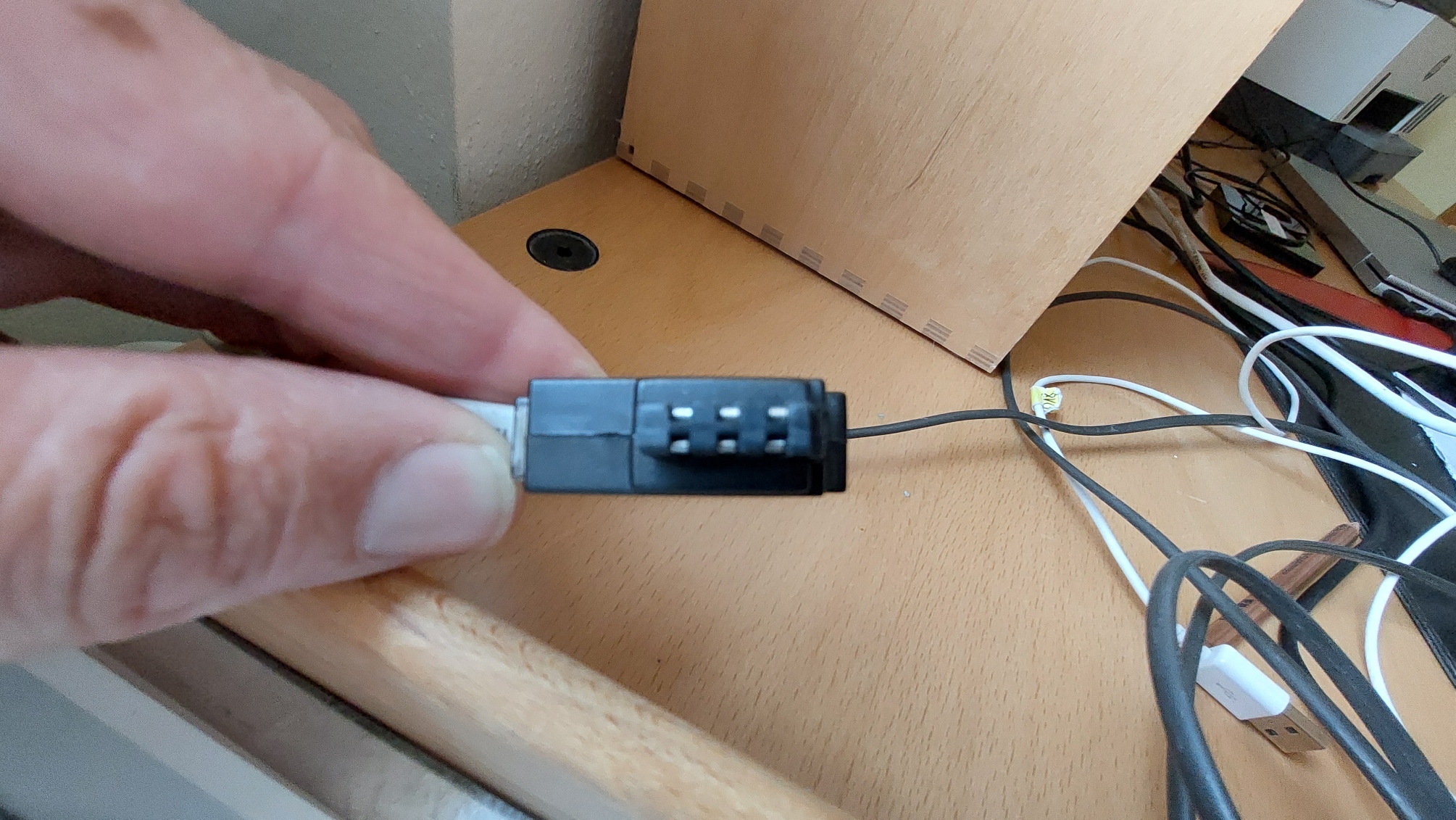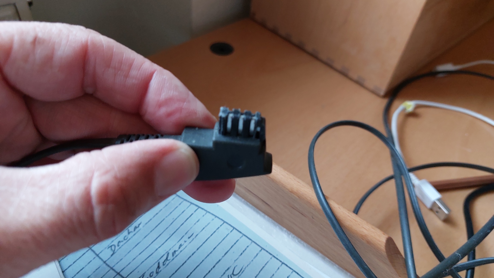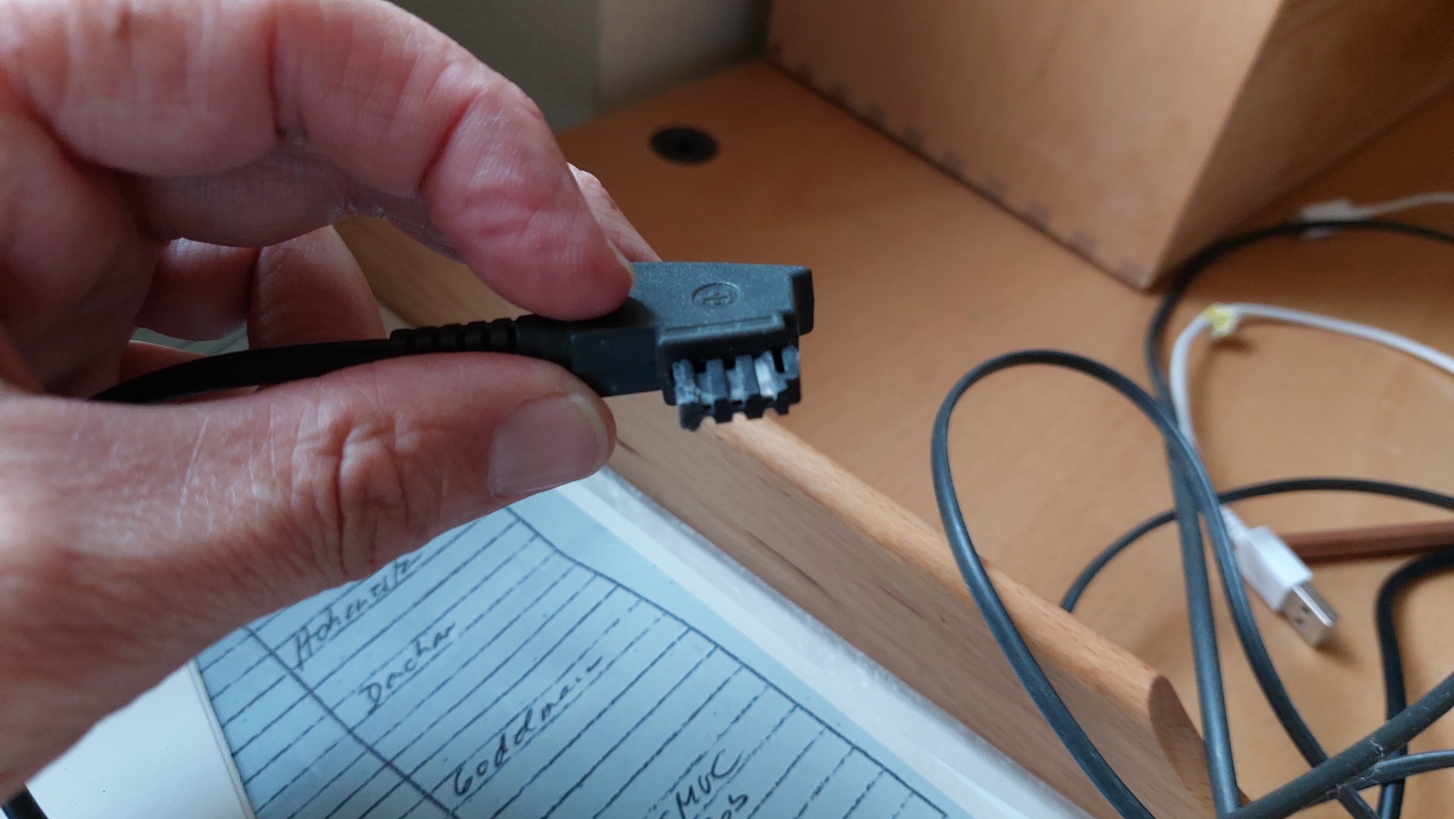 Wir haben vom EG in`s OG eine Telefonleitung diese endet in einer 3-fach Dose. Wie man an der Beschriftung erkennen kann, war dort einmal ein schnurgebundenes Telefon und das Vorgänger 4 in One Drucker- Scanner - Fax - Gerät von Canon angeschlossen. Man konnte telefonieren und mit dem Canon faxen.