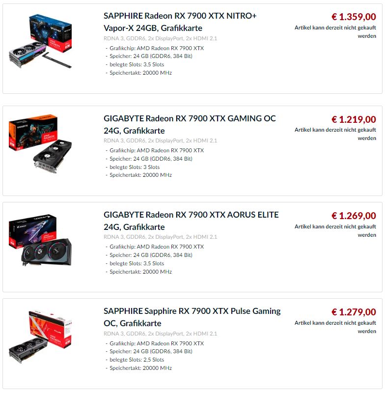 Wo wir gerade von der XTX und XT sprechen, die gibt es gerade im Mindstar in großer Anzahl. Scheint so als würden die kürzlichen Treiber- und Vaporchamber - Turbulenzen die Verkäufer im roten Lager drücken.