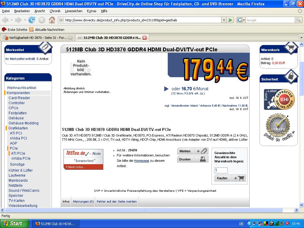 Alternate scheint auch wieder eine Lieferung GeCube 3870er @ Standard reinbekommen zu haben. Ich hab mir am Donnerstag um 23:00 eine per Nachname bestellt (209€ + 10,95€ = 219,95€), Verfügbarkeit war auf Rot.