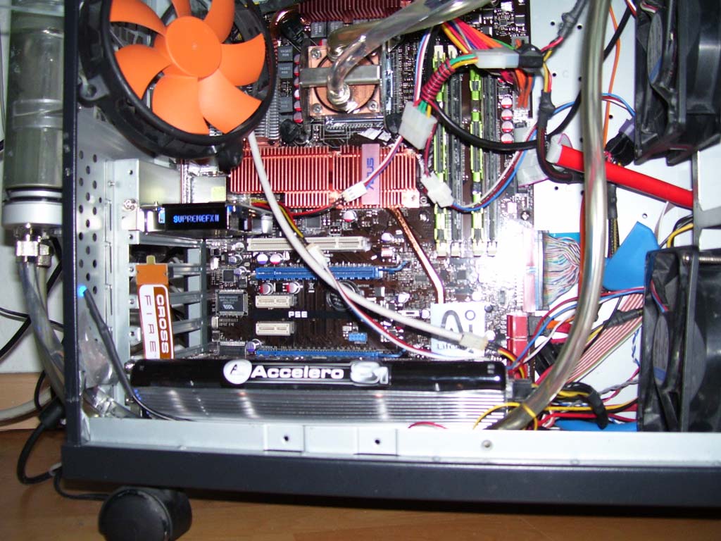 So, hier ist das Bild. Ich musste den Accelero s! relativ stark nach oben biegen damit der nicht mit dem "Rahmen" meines Towers da unten kollidiert