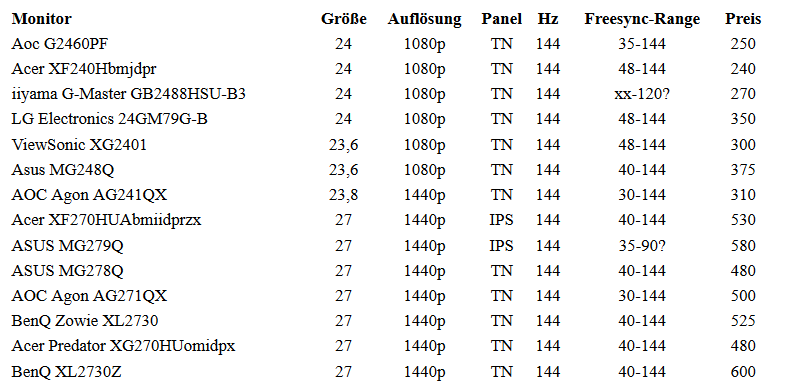 Für mich liegen alle, bis auf vlt. die mit den ungeklärten Freesync-Ranges in einem Bereich die mich persönlich interessieren würden. Weiterhin scheint mir der AOC Agon AG241QX mit 1440p auf 23.8" ein wenig suspekt.
