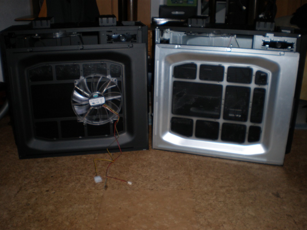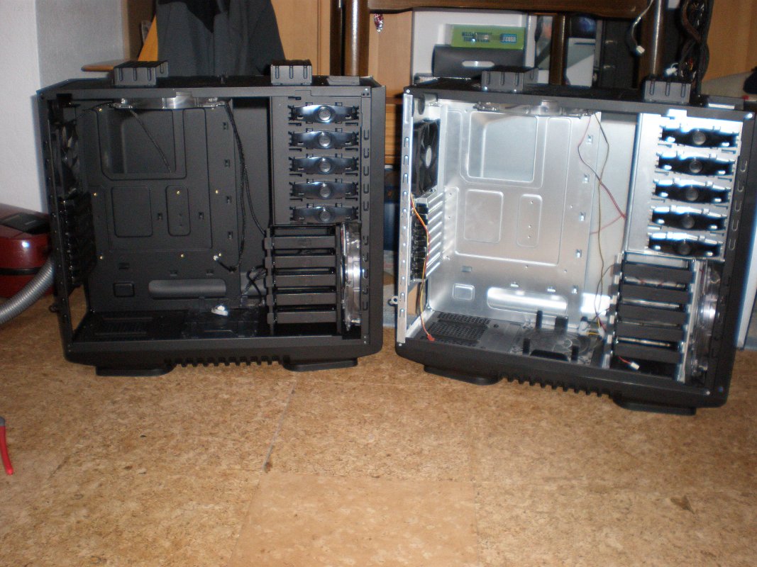 Die auffälligste Veränderung ist natürlich der nun ebenfalls schwarz lakierte Innenraum, darüber hinaus sind auch alle (wirklich alle!) Schrauben in schwarz gehalten. Außerdem befindet sich an der Seitenwand ein zusätzlicher 200mm Lüfter (Das gleiche Modell wie in der Front und unterm Deckel). (Nicht wundern den Sleeve habe ich selbst angebracht