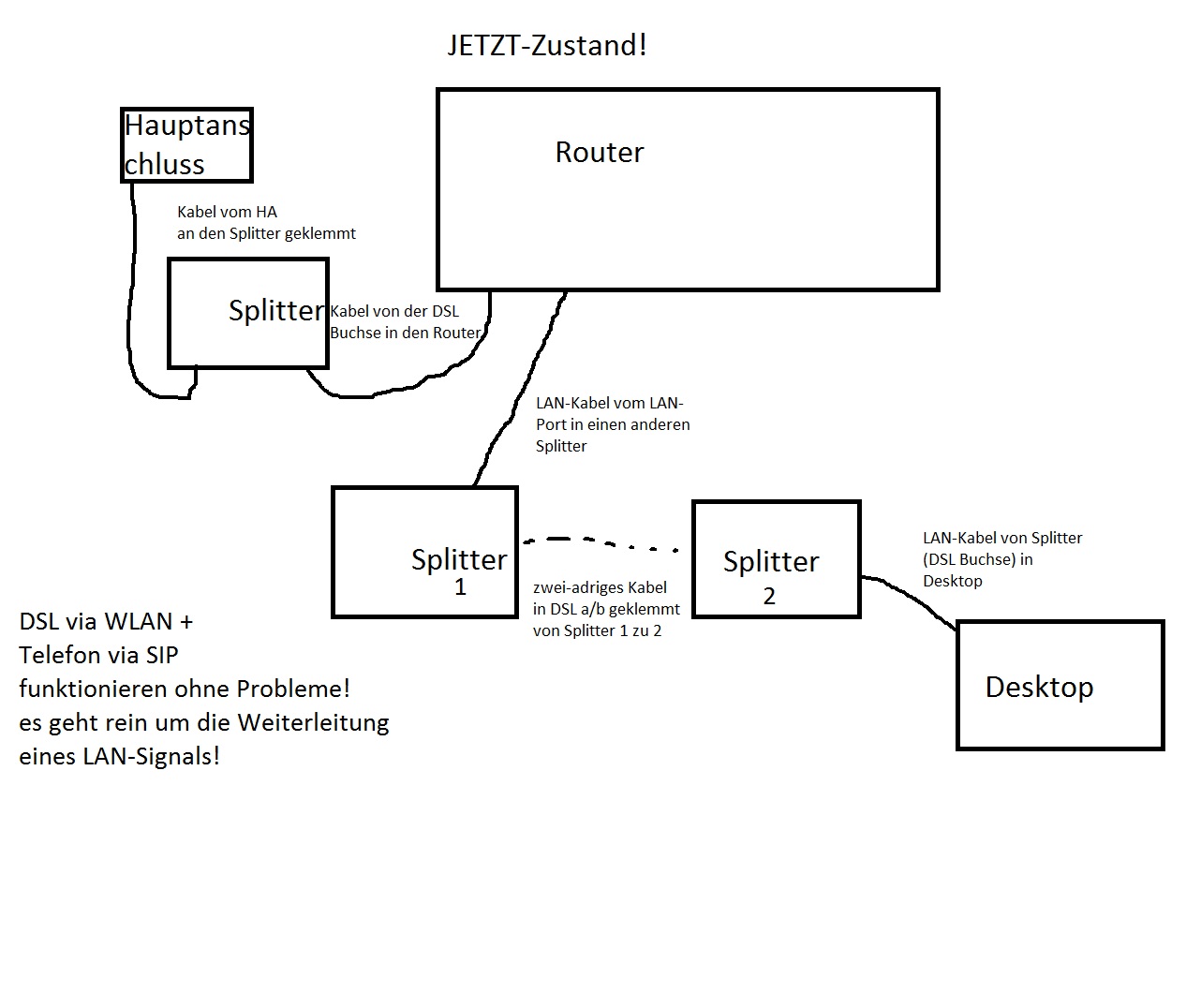 Splitter habe ich bereits ausgwechselt, die geklemmten Kabel in der a und b-Buchse vertauscht ... ich weiß nicht wieso das nicht funzt. Das muss funzen! Ich kann unmöglich ein LAN-Kabel durchs Haus ziehen und ich will ums Verrecken nicht per WLAN reingehen.