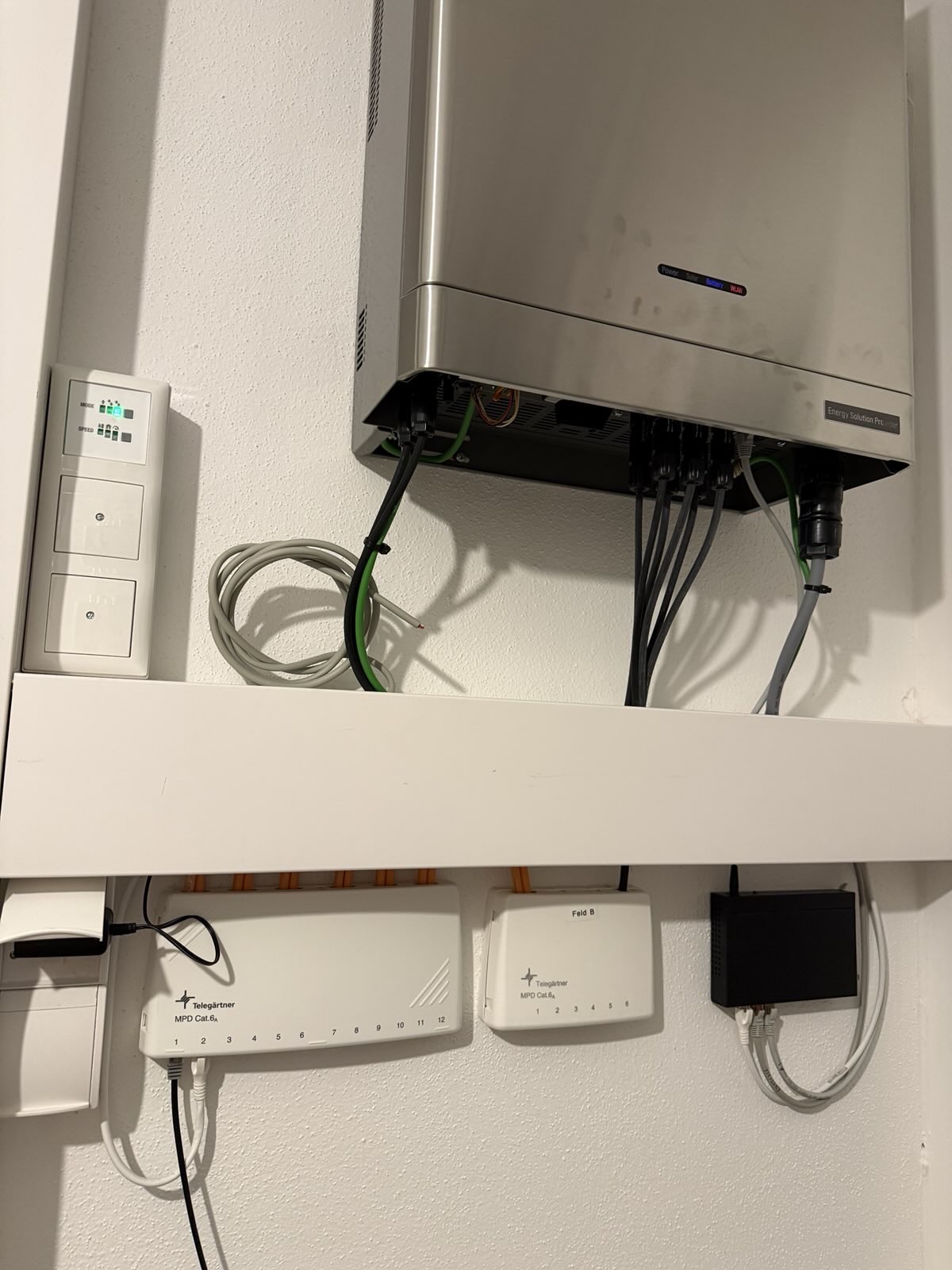 Das Haus hat eine PV-Anlage auf dem Dach und die entsprechende Technik (und mehr) scheint hier wohl mit dran zu hängen. Dazu gibt es Netzwerkdosen in jedem Zimmer, die wohl auch irgendwo hier verknüpft sein müssen. Welche Zweck erfüllt dieses Patchfeld aber wenn es direkt am Telefonanschluss hängt, ohne Router dazwischen?