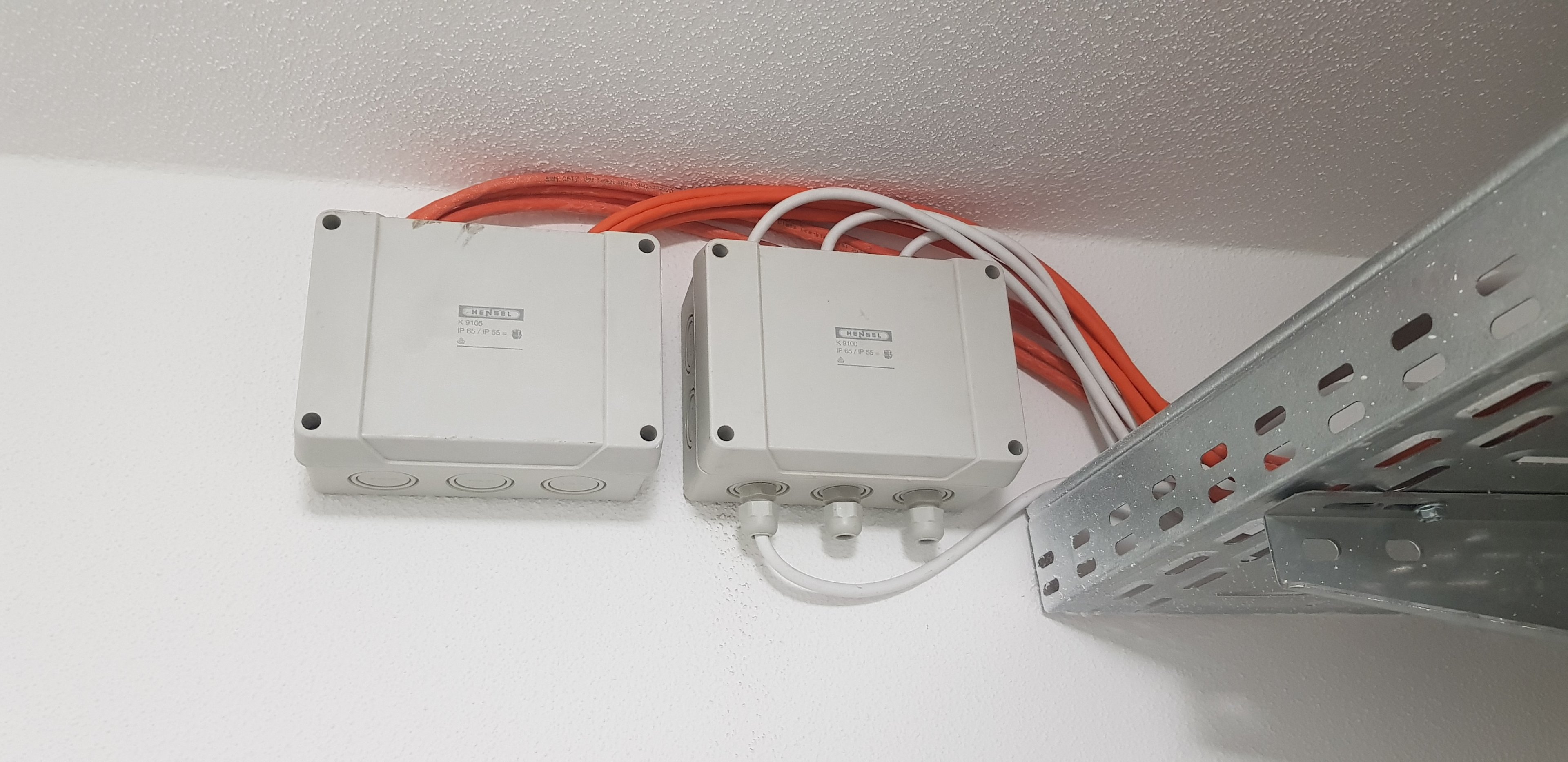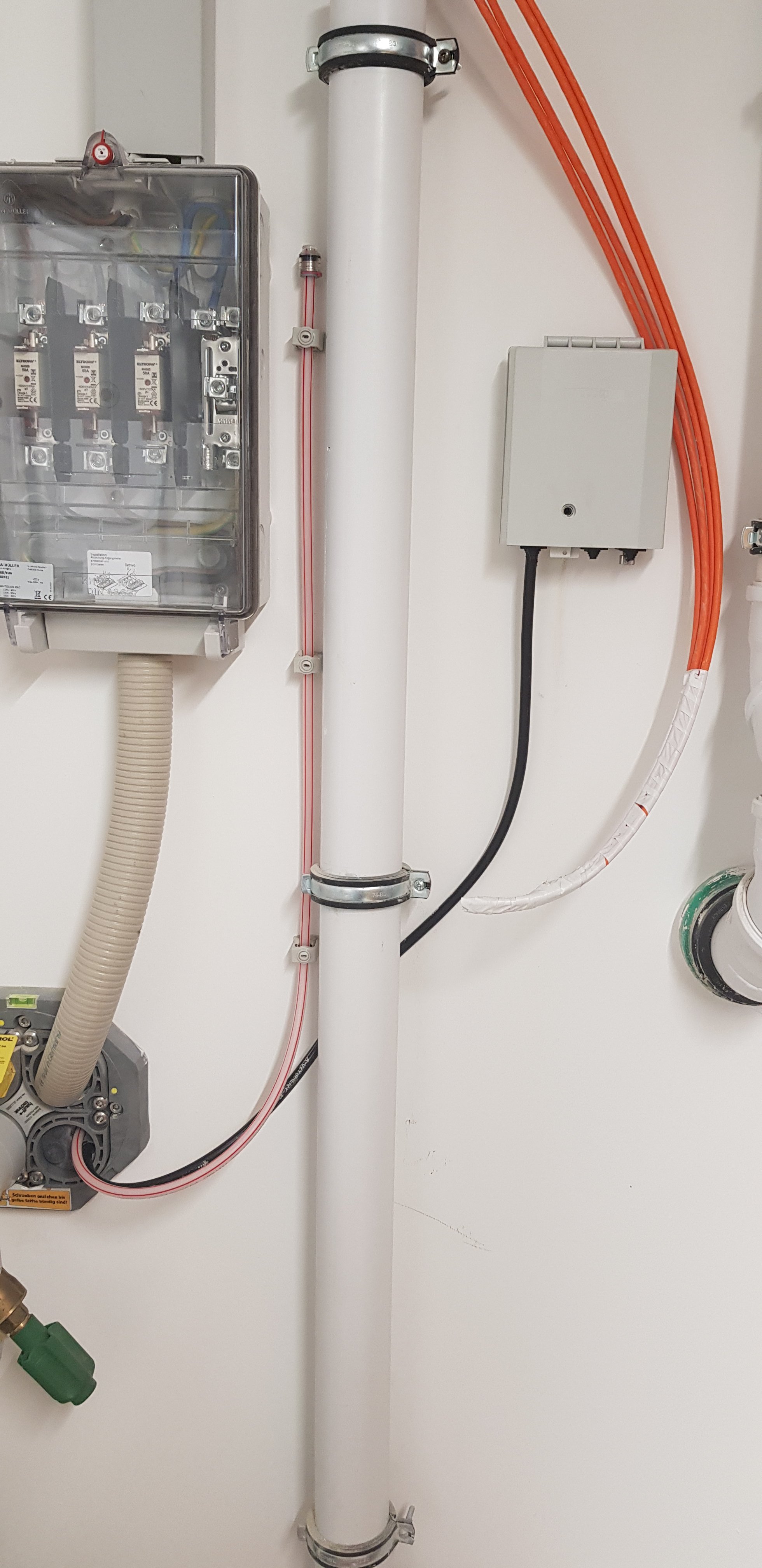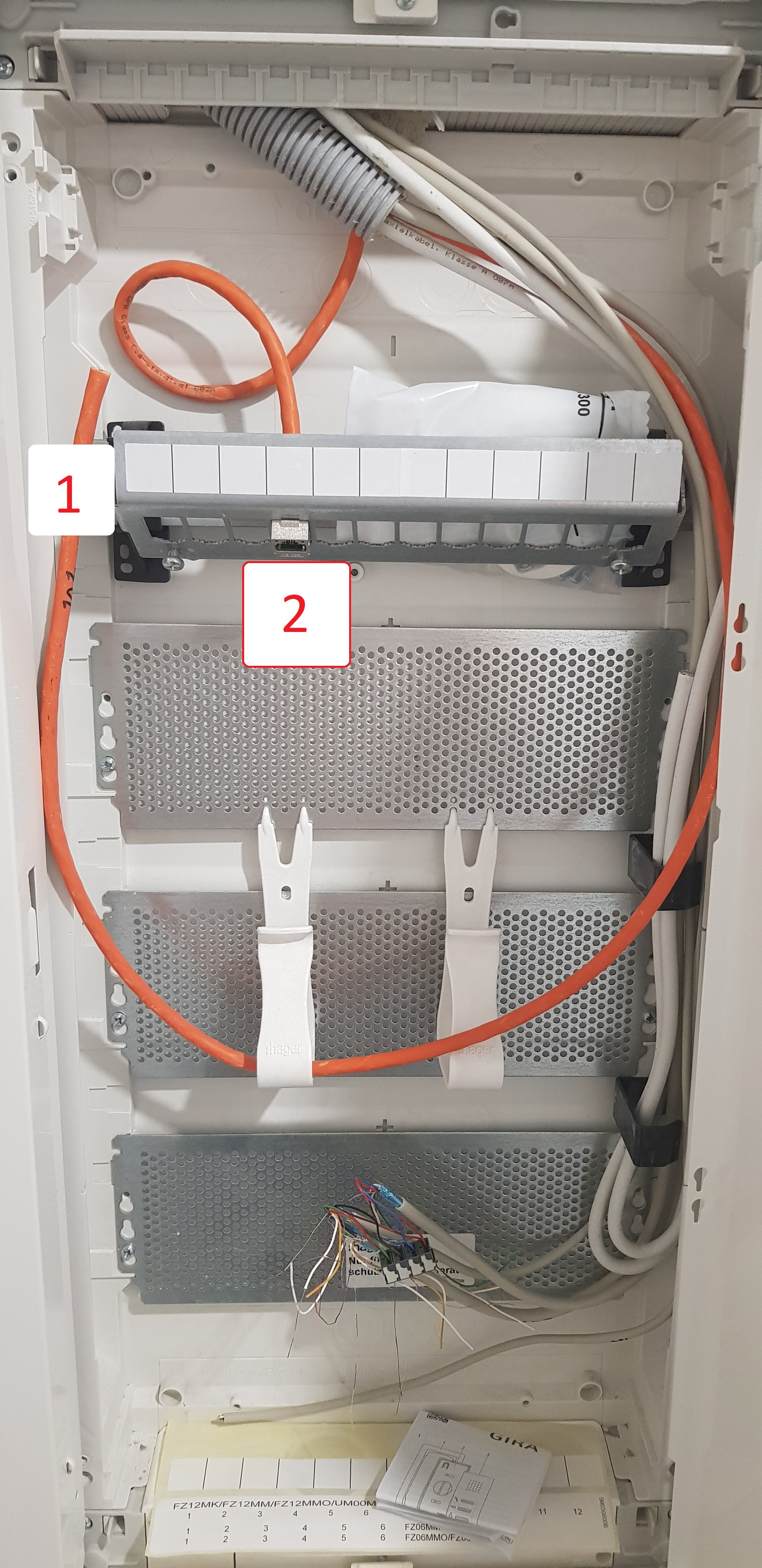 Die vier Cat7 Kabel (orange) sind sehr wahrscheinlich für die einzelnen Wohnungen (ebenfalls vier im Haus)