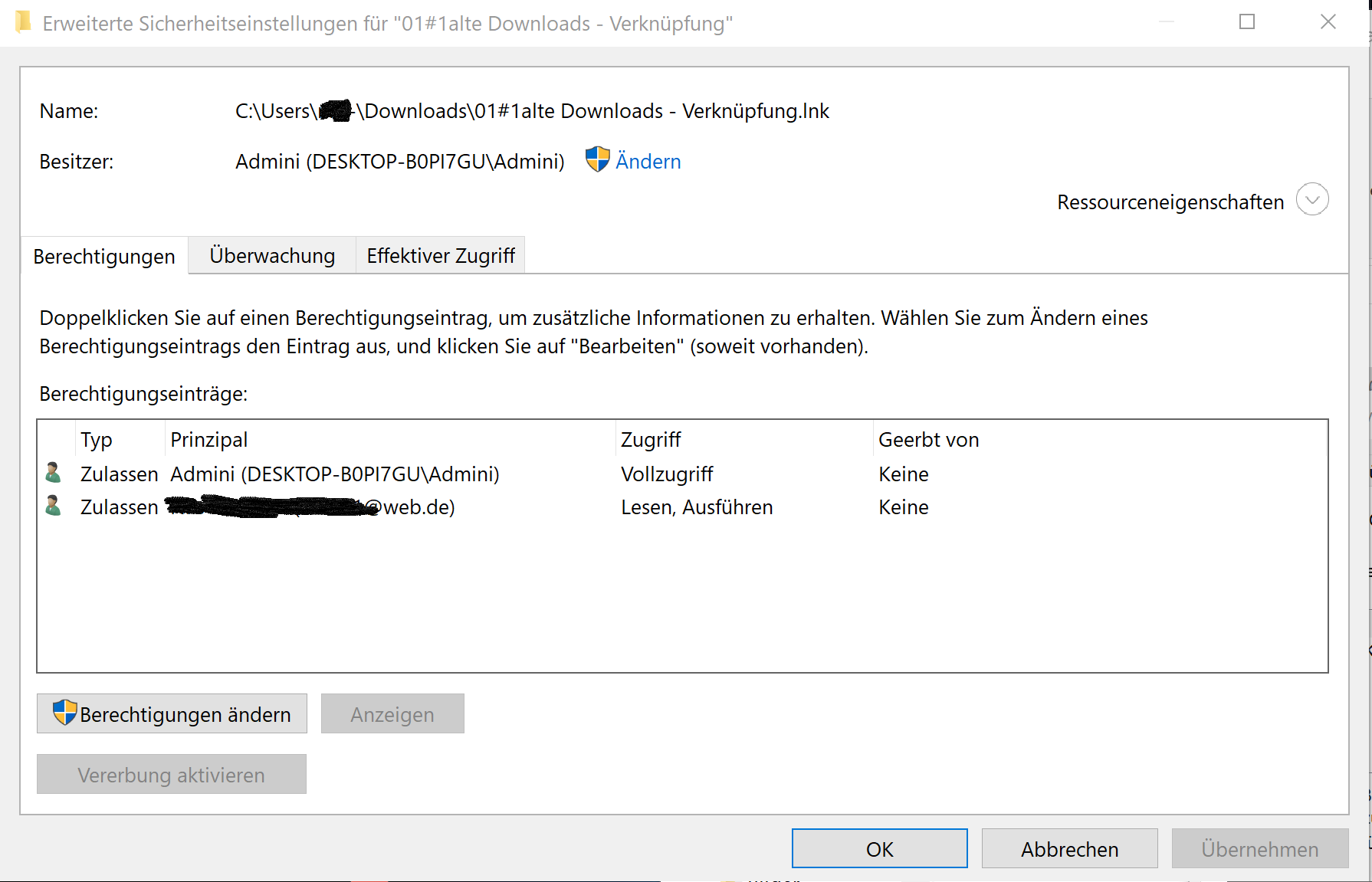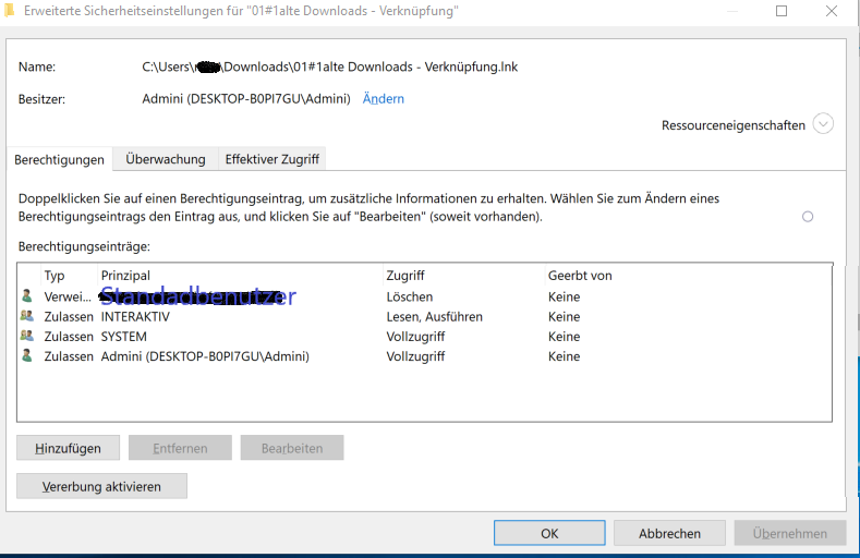 ich leere regelmäßig meinen Downloadsordner auf eine andere Festplatte aus. damit das leichter geht habe ich mir in den Download Ordner eine Verknüpfung zum Auslagerungsort erstellt. Nun möchte ich diese davor schützen, gelöscht zu werden, wenn ich alles markiere und verschiebe, btw. lösche. Ich dachte das geht, in dem ich einfach dem angemeldetem Standardbenutzer die Berechtigung "löschen" verweigere. Klappt aber nicht. Also weitergemacht mit verschiedensten Kombinationen (Standardbenutzer nur lesen und Ausführen, etc.). probiert habe ich auch, die gleichen Berechtigungen wie bei einer Desktopverküpfung, für deren Löschen ich auch das Admin PW eingeben muss, zu machen, haut aber nicht hin. Gerne kann ich euch gleich Screenshots der Berechtigungen machen.