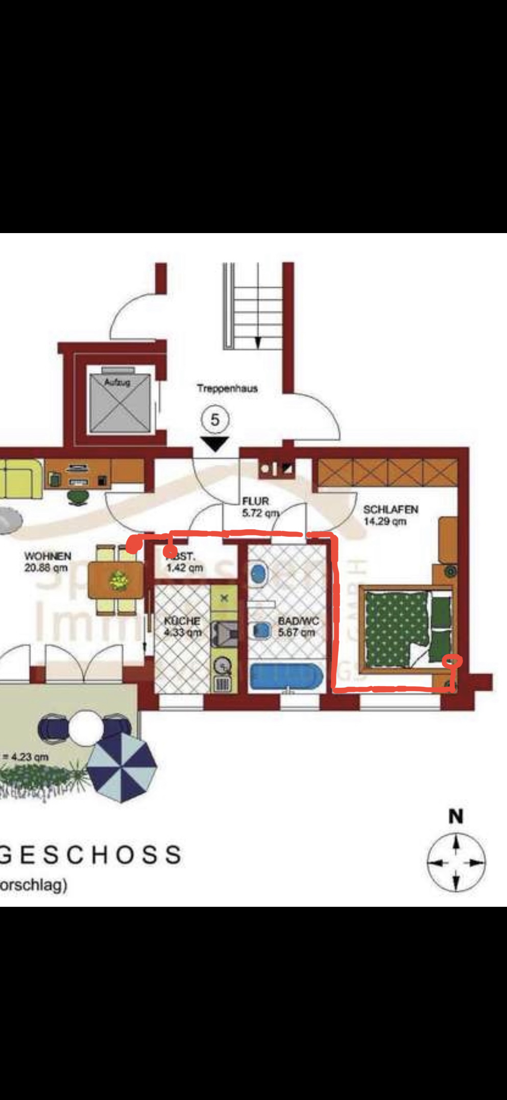 Die FRITZ!Box kommt im Schlafzimmer / Büro rechts unten an die Wand unter den Schreibtisch mit Desktop. Die Abstellkammer möchte ich gerne als Serverraum nutzen (NAS, Server, Pi, Hue, etc) und im Wohnzimmer soll dann noch TV und diverse Konsolen, Shield etc angeschlossen werden. Der AP kommt entweder in die Kammer oder ins Wohnzimmer- je nachdem wie stark das Signal gedämpft wird. Aber Abstellkammer wäre am besten.