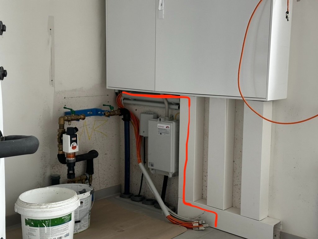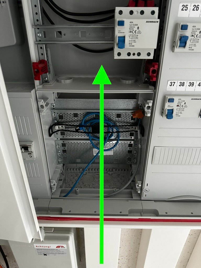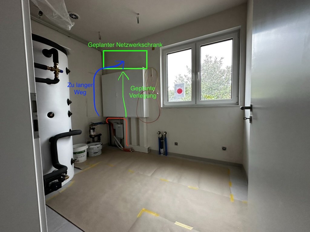ich habe folgende Frage: in unserem Hauswirtschaftsraum treffen alle Netzwerkkabel vom Haus zusammen (ca. 12 Stück). Leider hat unser Elektriker die Kabel zu kurz gemacht und ich kann nicht - wie geplant - über dem Elektroschaltschrank den Netzwerkschrank (19 Zoll, 6 Einbauhöhen). Ich traue mir leider nicht zu, die Kabel selbst zu verlängern und neue Keystones zu setzen. Da ich wegen anderer Installationen den Netzwerkschrank nicht woanders positionieren kann, ist mir die Idee gekommen, einfach die Kabel durch den Schrank zu verlegen, statt um diesen herum (siehe angehängte Fotos). Im mittleren Bereich des Schranks ist bis auf einen FI-Schutzschalter. Stromzähler befinden sich im linken Teil des Schranks, Sicherungen und die restliche Unterverteilung rechts.