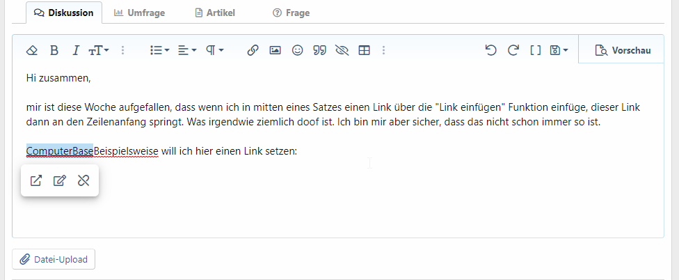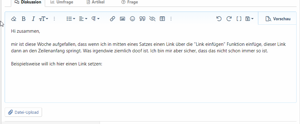 mir ist diese Woche aufgefallen, dass wenn ich in mitten eines Satzes einen Link über die "Link einfügen" Funktion einfüge, dieser Link dann an den Zeilenanfang springt. Was irgendwie ziemlich doof ist. Ich bin mir aber sicher, dass das nicht schon immer so ist.